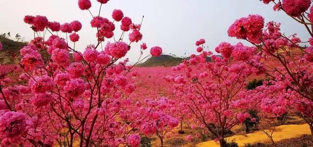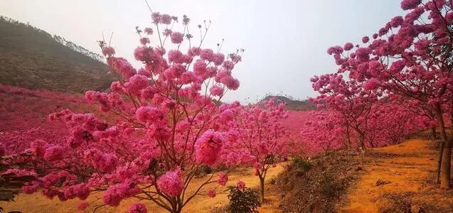 13:45-17:00 游览拍摄【紫花风铃木】,34万平方米的紫花风铃,满树铃铛、姹紫千红的紫花风铃盛开,构成一幅美如童话的仙境,会让你深深的感到震撼!摄影家的天堂!