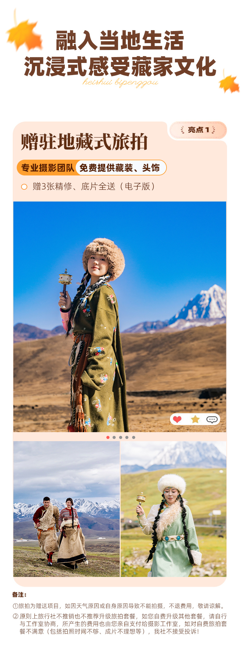 1、驻地藏式旅拍1次(免费提供藏装/首饰,赠3张电子版简修,底片全送);