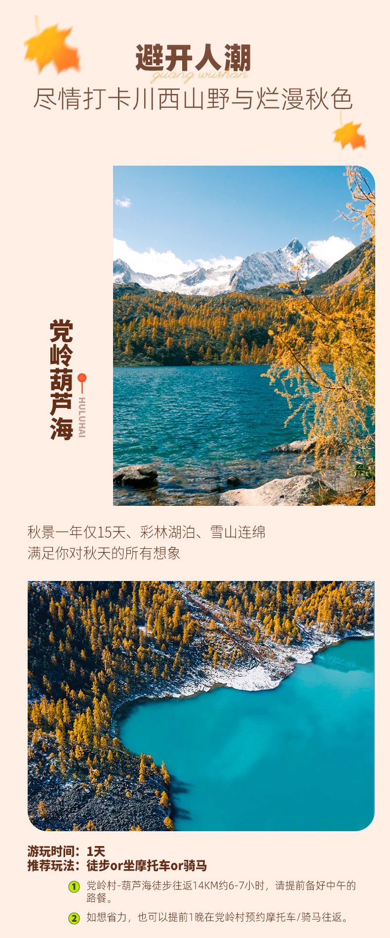 4、景交:红海子清洁费30元/人(可选),鱼子西清洁费30元/人(可选),亚拉雪山观光车90元/人(必须),党岭环保费30元/人(必须)、党岭村至葫芦海骑马/摩托车费用200-300元(可选);