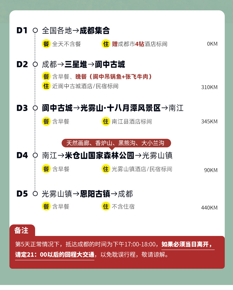 1、用餐:全程4个早餐+1个特色餐(阆中吊锅鱼+张飞牛肉),如队员另外点餐,需自己支付费用;
