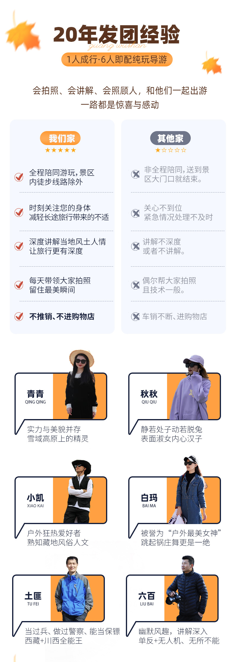 4、导游:优秀纯玩导游服务(1-5人司机兼向导,6人及以上配专职导游,已含导游食宿门票);
