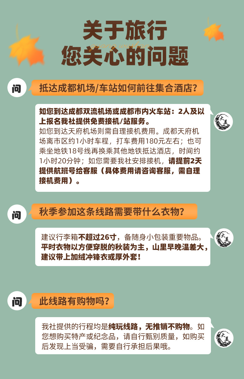 2、住宿:全程4晚住宿(成都升级1晚4钻酒店、集合日赠送酒店不住不退);