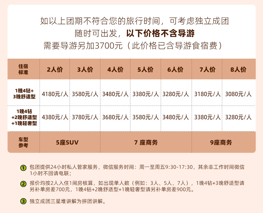 【成团说明】1人成行,1-5人司机兼向导,6人及以上配纯玩导游,24人封队;