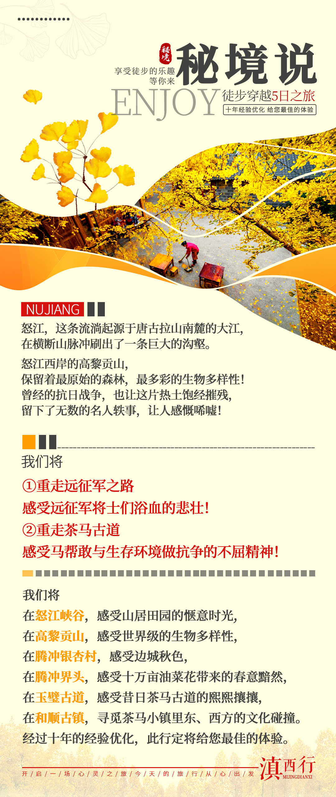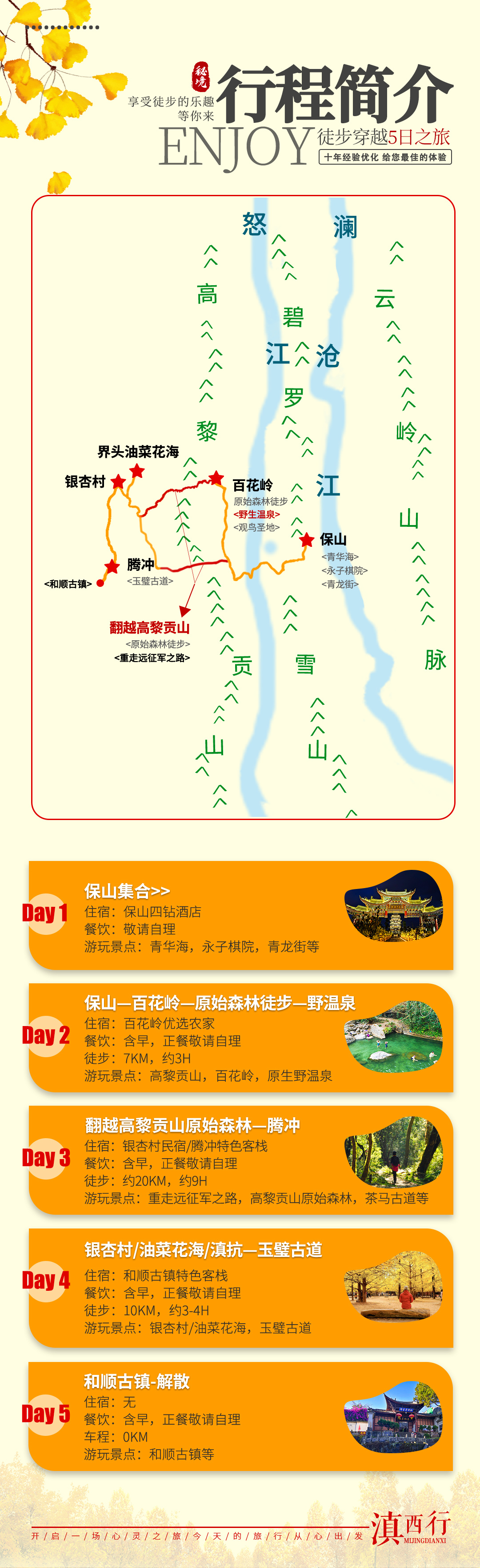 1、银杏观赏季为11月-12月;油菜花观赏季为2月-3月;在非观赏季节,我们将调整行程为拜访【滇西抗战纪念馆】,听远征军抗战的历史,回首往昔的峥嵘岁月。