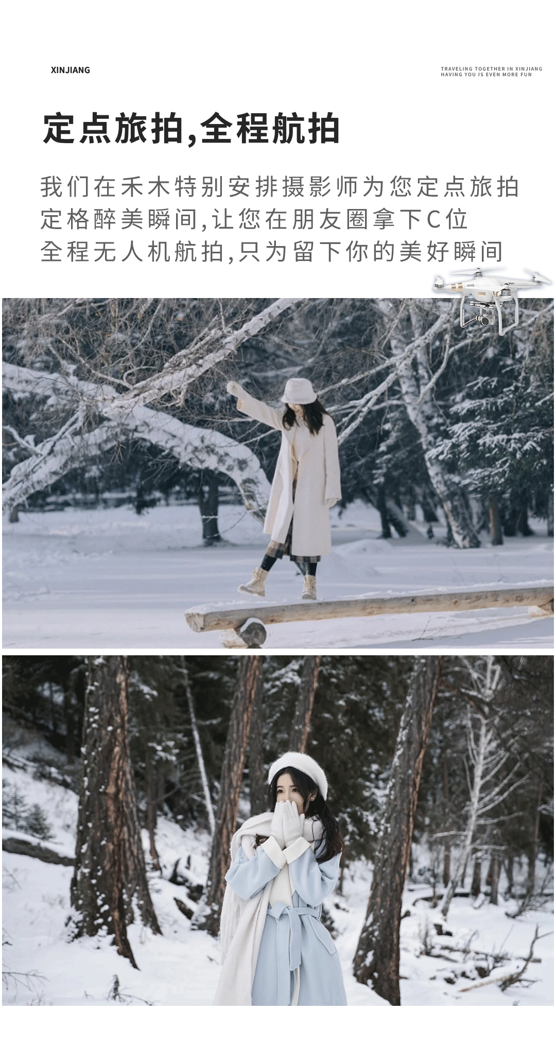 2、赠送无人机跟拍,禾木定点旅拍(不含妆造,每人9张简修照);