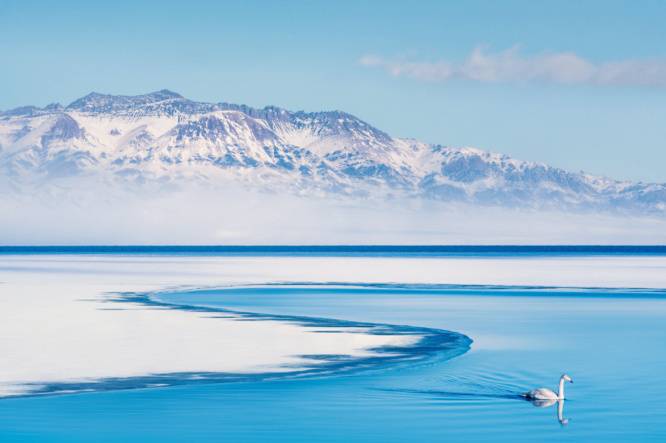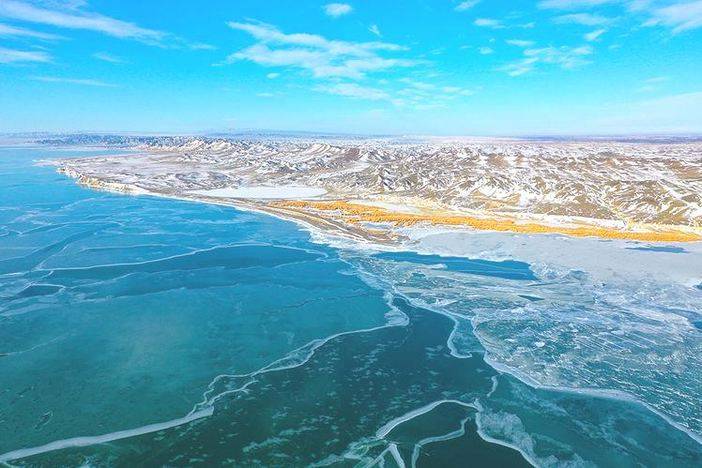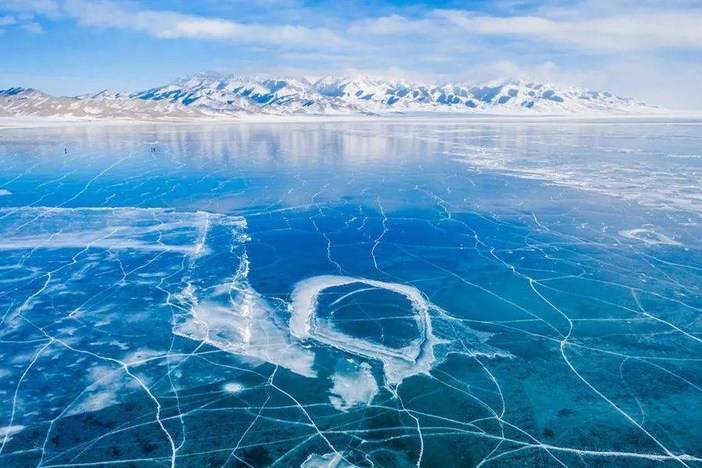 早起后正式游览赛里木湖,首先我们可以前往体验冰雪UTV,一起飞驰于蓝冰之上,感受冰雪中越野的狂野刺激。随后开始环湖,冬天,湖泊底部茂盛的水草产生的气泡,为冰泡景观的产生提供了基础。赛里木湖冬季十分寒冷,冰封期有时可以达到5个月之久,气温骤降之时,冰雪一夜就能覆盖湖面,冰泡层层叠叠,十分壮观。冰泡被封冻在湖面之下,阳光灿烂时,蓝色的湖泊好似一块掉落人间的蓝宝石。再加上四周环绕的群山,更是与蓝色的冰湖、白色的冰泡辉映,组成了一幅美丽的画面。此外,与新疆的其他湖泊相比,赛里木湖不仅海拔高,而且风特别大,有时可以达到8—9级。呼啸的狂风,能将堆积在湖面上的积雪快速地清理干净,并且还能将湖面打磨得更光滑,提高冰层的透明度,为冰泡的展示提供“舞台”。