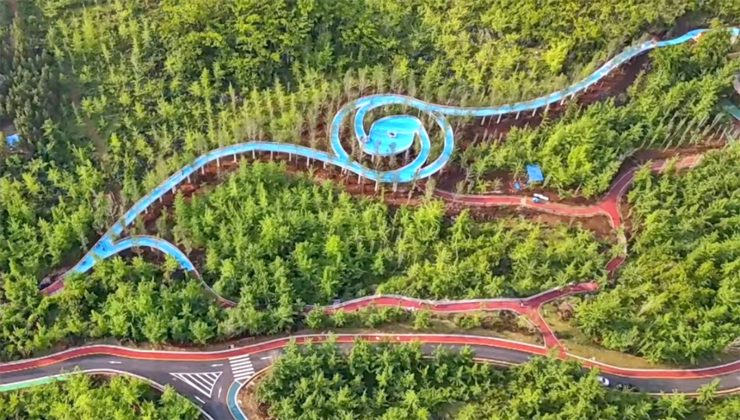 蓝色的栈道像丝带一样穿越银杏林