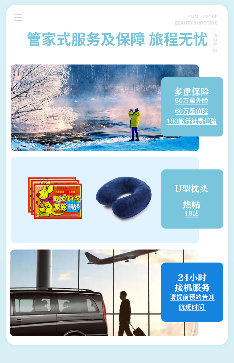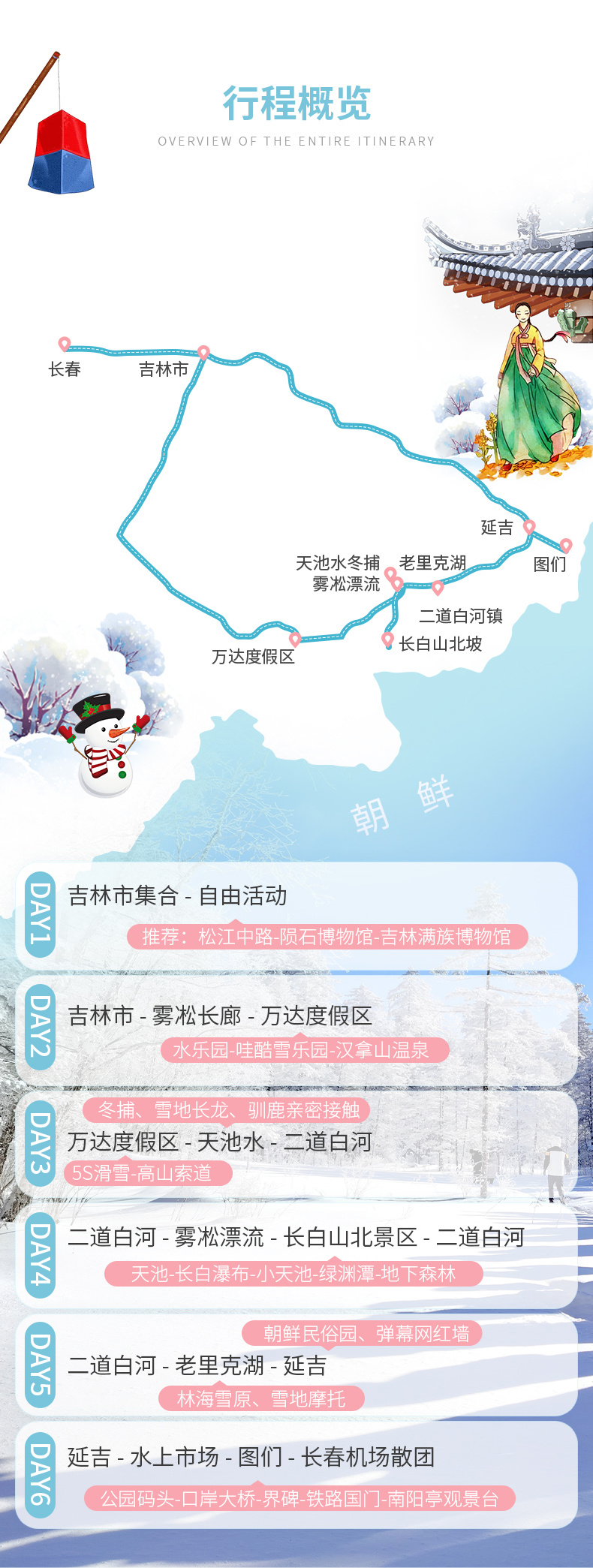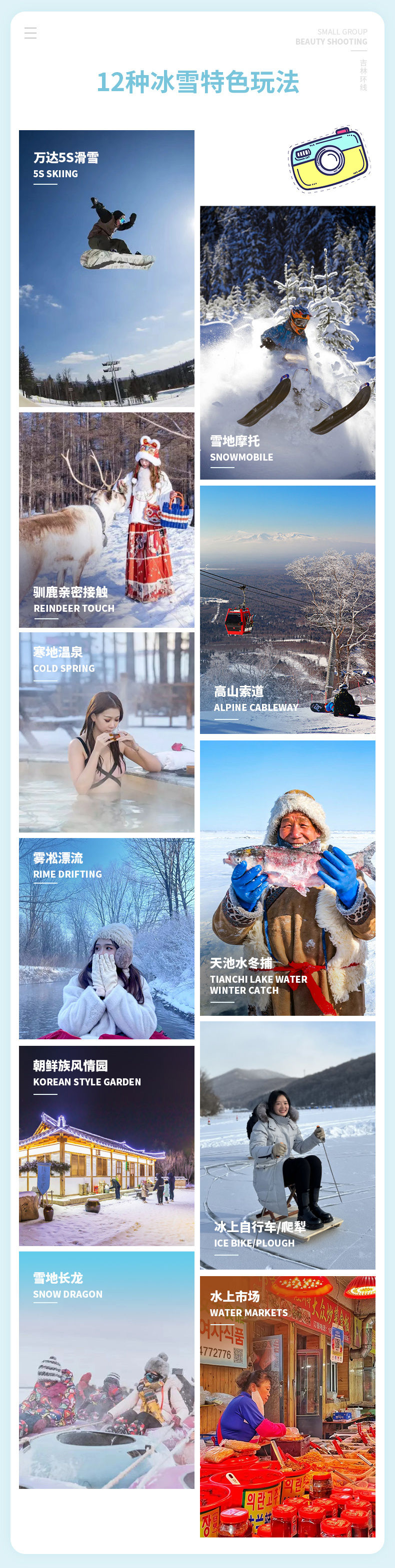 门 票:长白山北景区大门票+环保车+换乘车+天池主峰倒站车、雾凇漂流门票、老里克湖门票+马拉爬犁+雪地摩托、朝鲜民俗园门票、图们口岸门票、天池水冬捕套票;
