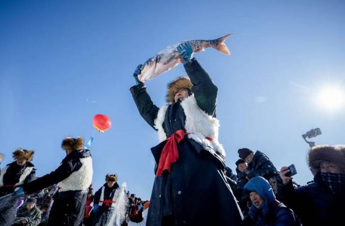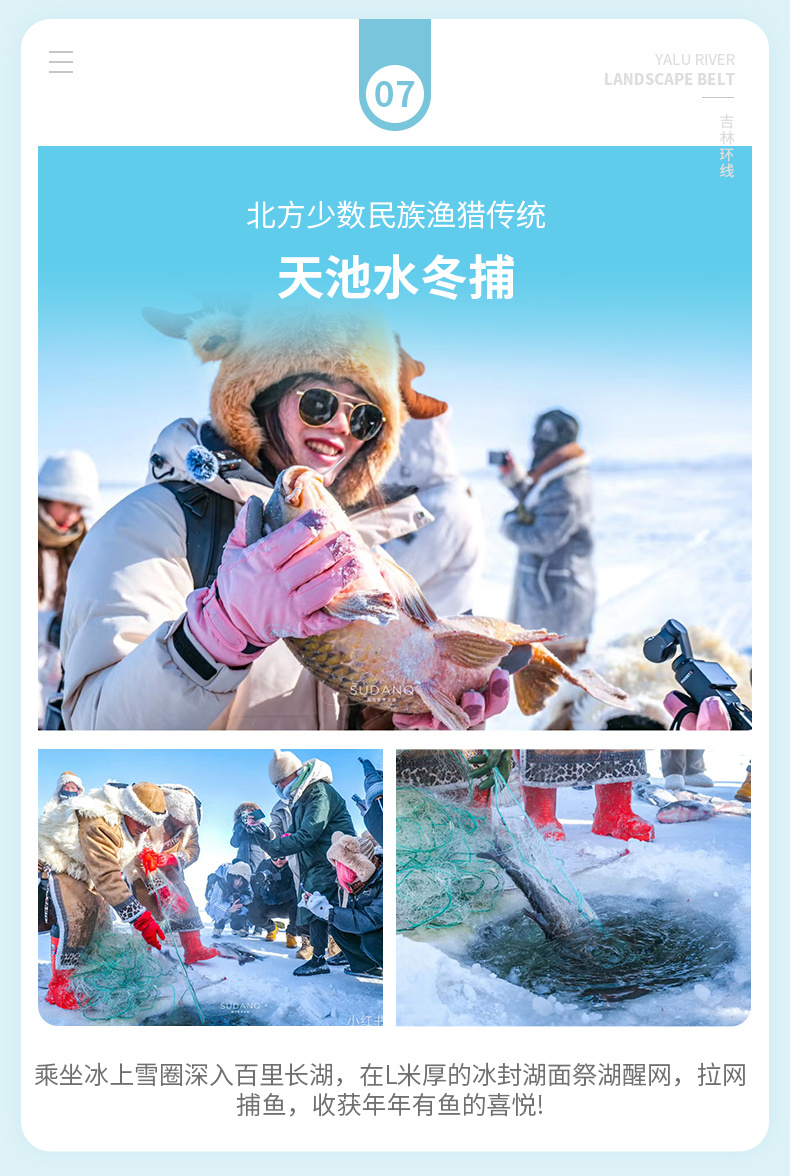 √ 游玩14:30-16:10,欣赏传统渔猎「天池水冬捕」,冬捕是东北地区独特的一种捕鱼方式。在一米多深的冰面上凿洞下网,随着一个个东北汉子卖力呼喊与拖拽,一条条肥硕的大鱼不断的随网而出。您可以尝试着与渔民一同收渔网、抓头鱼,感受冰腾湖鱼的壮观场面和年年有余的美好祝愿!体验惊险刺激的「雪地长龙」,丰富有趣的冰上活动「抽冰嘎」、「碰碰球」、「冰上爬犁」。