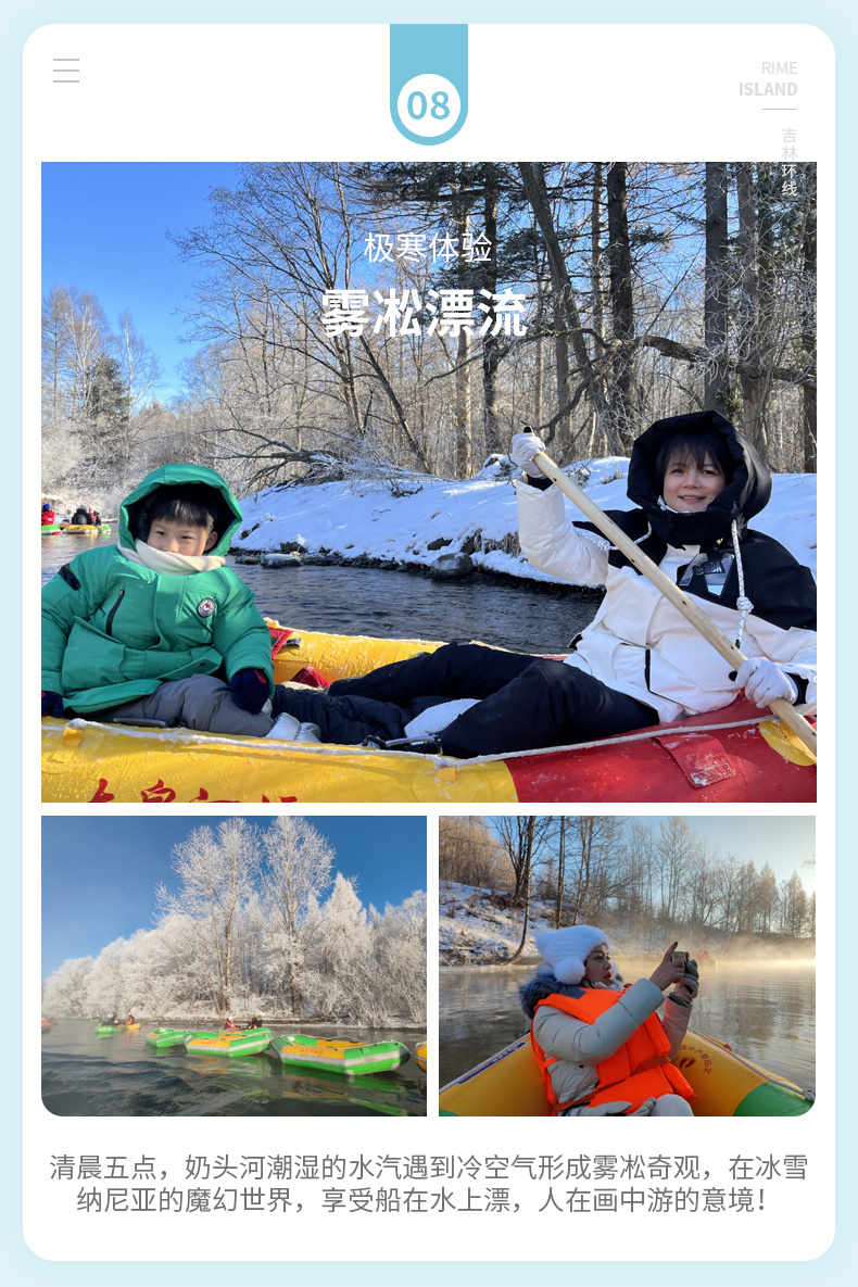 √ 漂流06:45-07:45,乘皮筏体验「雾凇漂流」顺流而下,边欣赏独特的雾凇,边享受漂流的激情与刺激,一定有一种别样的感觉。