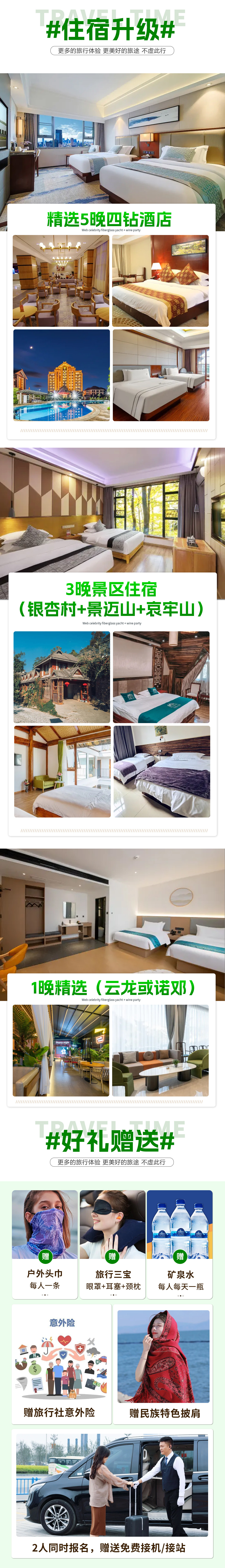 【住宿升级】5晚四钻酒店+3晚景区住宿(银杏村+景迈山+哀牢山)+1晚精选酒店(云龙或诺邓)的优选组合,不惜成本,旺季住进核心景区,留更多时间在景点游玩。