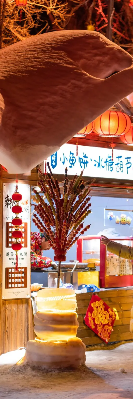 结束后逛一逛【云顶集市】位于长白山北景区的二道白河大街,市集以“温暖”为主题,极具东北年味。市集商铺采用东北老式,小木屋造型,装饰有厚厚的积雪和大红灯笼。在这里,人们可以品尝到东北特色美食如冰糖葫芦、烤地瓜、朝鲜族打糕、烤冷面等等,冬天可以体验打雪仗、堆雪人等活动。晚餐后入住酒店休息;晚餐品尝东北铁锅炖。