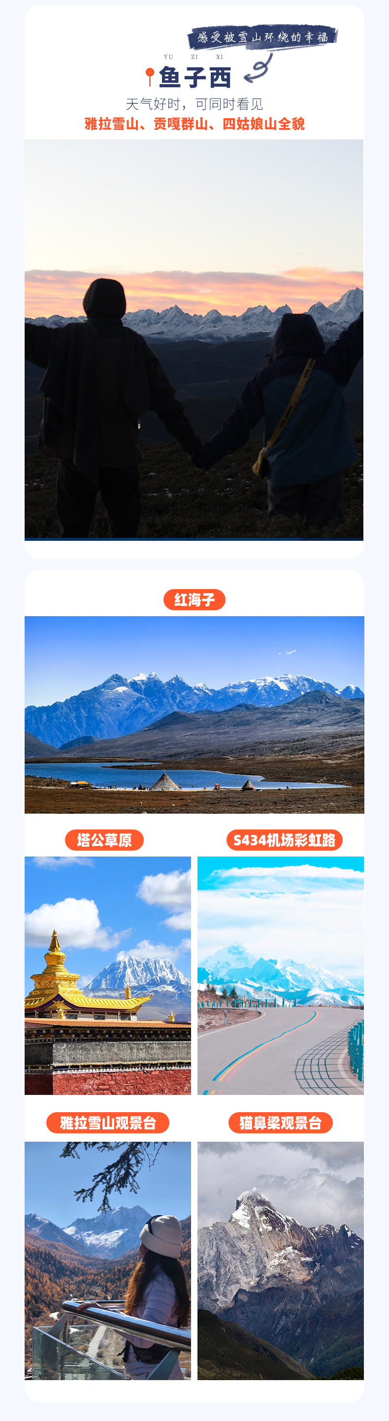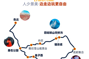4、景交:四姑娘山双桥沟观光车70元/人(必须);墨石公园观光车20元/人(必须);红海子清洁费30元/人(可选);鱼子西清洁费30元/人(必须);色达乘车票48元/人,报名后请根据自己的游玩日期自行预约;