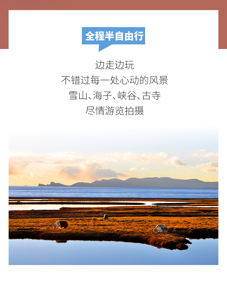 从拉萨出发,沿拉日高速,驶上被称为观光大道的S307省道,翻越海拔4990米的【岗巴拉雪山】前往【羊卓雍措(简称羊湖)】。羊湖是西藏三大圣湖之一的淡水湖,湖水甘甜、如羊脂般清澈,可以饮用。湛蓝的湖水与远方的雪山连为一体,加上两岸各色的山脉、极具特色的藏族村落、遍地的牛羊,一路走来,心旷神怡。【岗巴拉山顶】是欣赏羊湖最佳位置,建议游玩时间30分钟左右。山下的观景台是可以近距离接触羊湖的地方,如果天气好的话,可以看到远处的宁金抗沙峰,许多登山爱好者会在这座山峰攀登训练。碧蓝的羊湖和远处白雪皑皑的雪山,遥相呼应,简直就是眼睛的天堂。欣赏完美丽的羊卓雍措,开始返程。如果有需要送机或送火车的小伙伴,请提前告知司机师傅你们的航班/车次,让师傅提前规划送机/站时间,以免耽误您的行程。