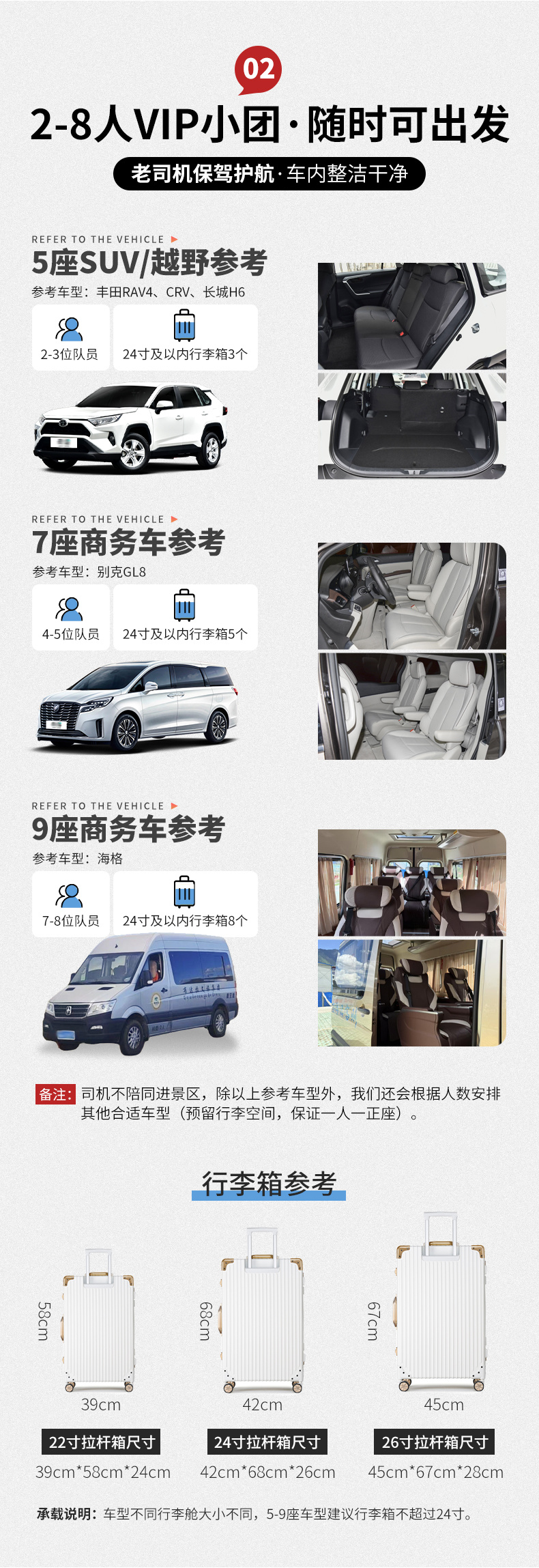 1、交通:5-9座全程专属用车及司机星级服务(全程司机兼向导,已含驾驶员食宿,驾驶员熟悉线路,会给队员提供行程建议,全程边走边玩,保证多次停车服务,但不会像专业导游一样解说,且不陪同队员进景区,请理解);