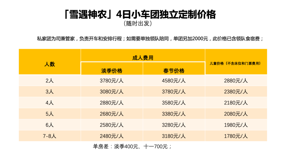 2.单人房差费用:住宿费用是按照2人入住1个标准间安排,若有单人报名,不愿拼房的情况,将会产生单人房差情况。