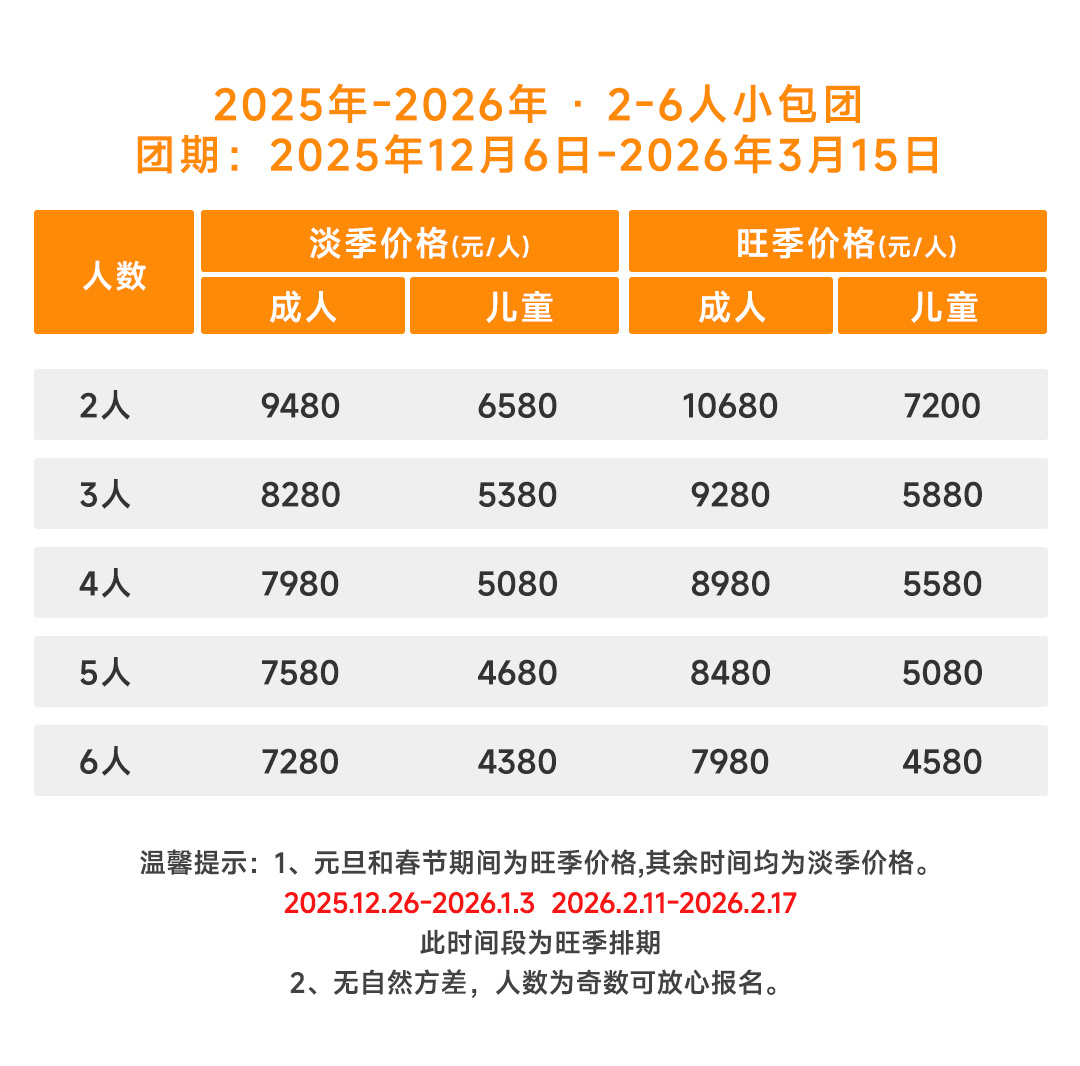 以上排期统一售卖价:成人9680元/人,儿童 6180 ,单房差3500