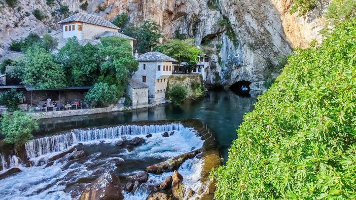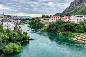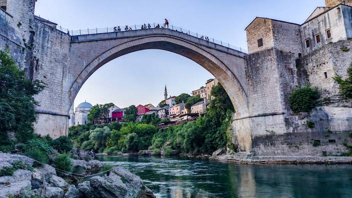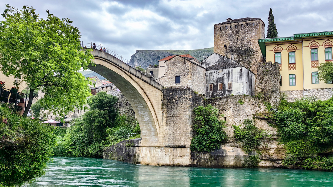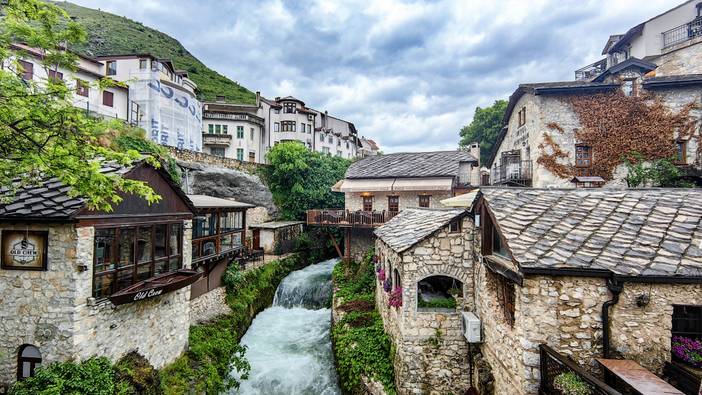 波黑——莫斯塔尔老城的老桥区:16世纪奥斯曼古桥横跨翡翠色内雷特瓦河,两岸中世纪石屋与清真寺相映,见证波黑多元文化交融,跳水勇士传统延续450年。