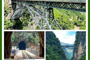 随后沿着国道,途径大片荔枝园后,来到【人字桥村】,我们来一段滇越铁路的【轻徒步体验】,沿着铁轨前行几百米,穿过山洞,近距离的来到桥边,这是800余名中国劳工血泪建成的已经沿用了100多年的的人类奇迹—【人字桥】。运气好,还能看到经过桥上的运输货物的货运火车。看完桥以后就返回下来谷底,沿着峡谷栈道,从另外一个角度还可以看到它的全景风貌。