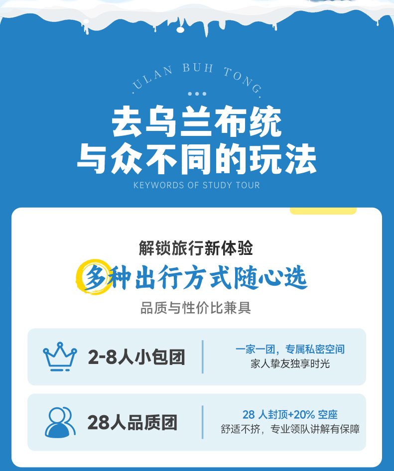 注:8人内司机兼向导(含8人),8人以上安排1名资深领队,15人(含15人)及以上安排摄影师跟团旅拍