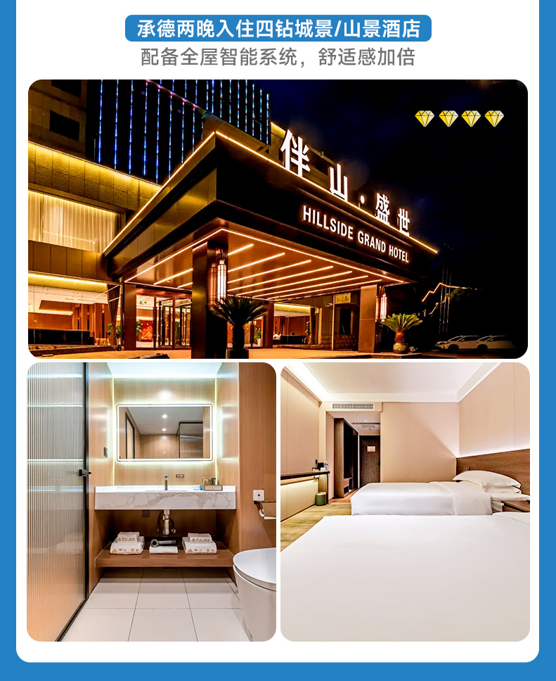 行程中的所列的酒店类型,以携程钻级/美团档型为参考。2星/2钻=经济型;3星/3钻=舒适型;4星/4钻=高档型;5星/5钻=豪华型;意为评定或条件到达相应标准的酒店,少部分地区,由于政策等因素,可能存在酒店条件满足,但未进行星钻评定的情况。