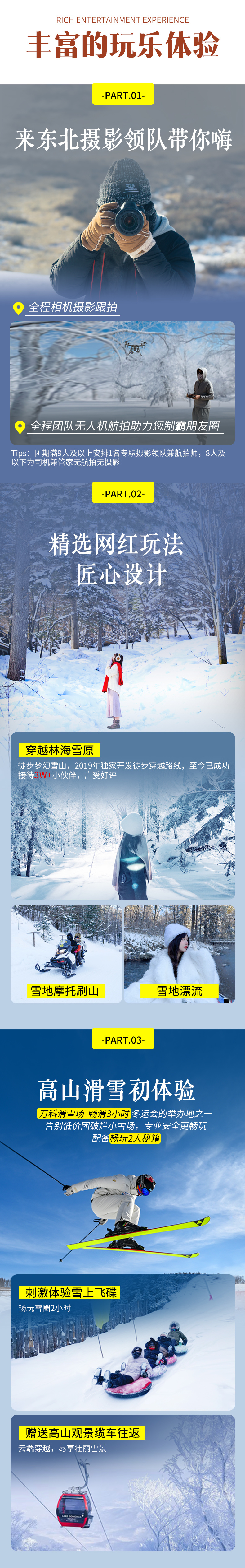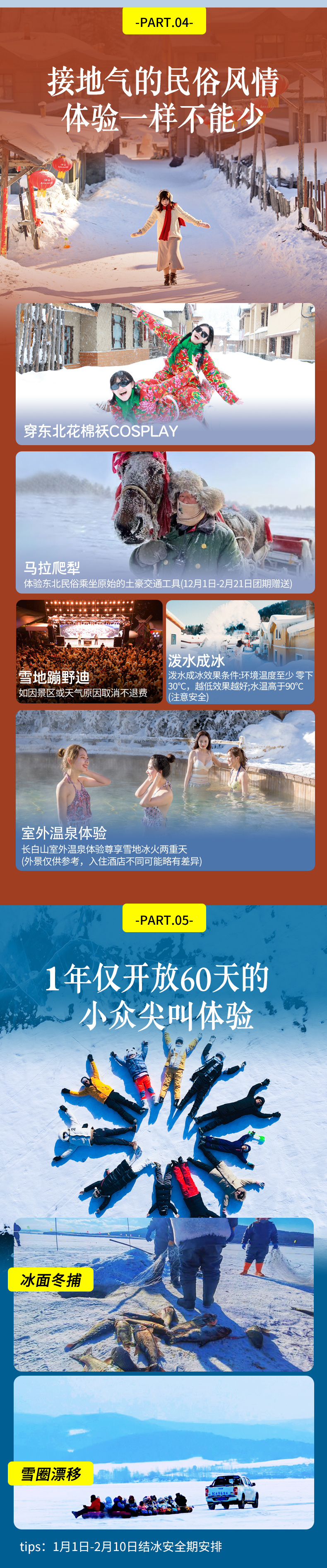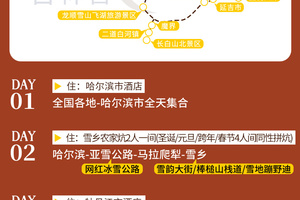 1.2米以下为儿童,含车位费、雪乡炕位、滑雪、赠送项目、保险、免门票、免早餐,不含酒店住宿、不含雪地漂流,不含温泉正常1.2米以下免票如遇收费自理;超高但未满12周岁需补门票440元+温泉100元/次+早餐费190元;如需占床需补床位费5晚酒店1400元/人含早餐含温泉,1晚农家炕如想单住请现询客服。 |