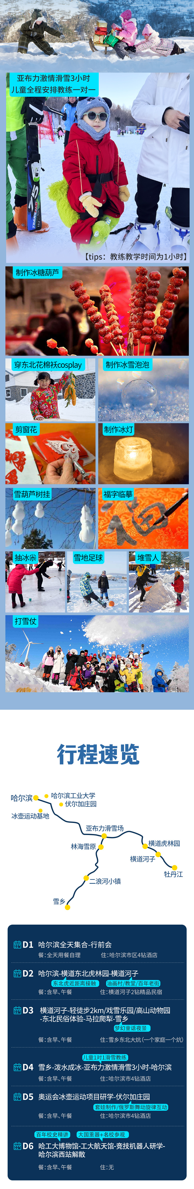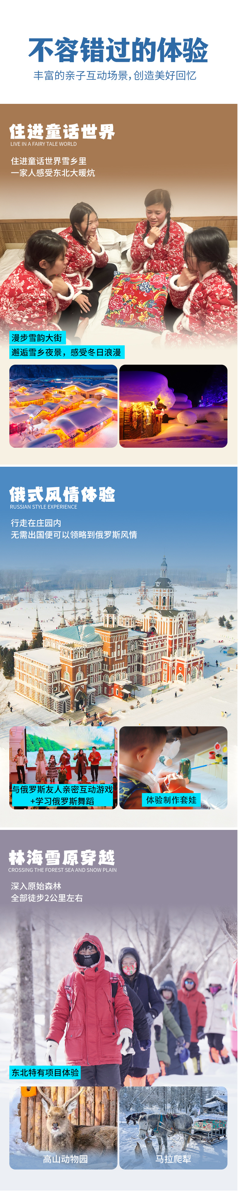 横道河子-(130km,约2.5h)马拉爬犁/冰糖葫芦制作/剪窗花-(20km,约0.5h)林海雪原轻徒步2km/戏雪乐园/高山动物园/堆雪人比赛-(30km,约0.5h)雪乡-冰灯制作/花棉袄cosplay