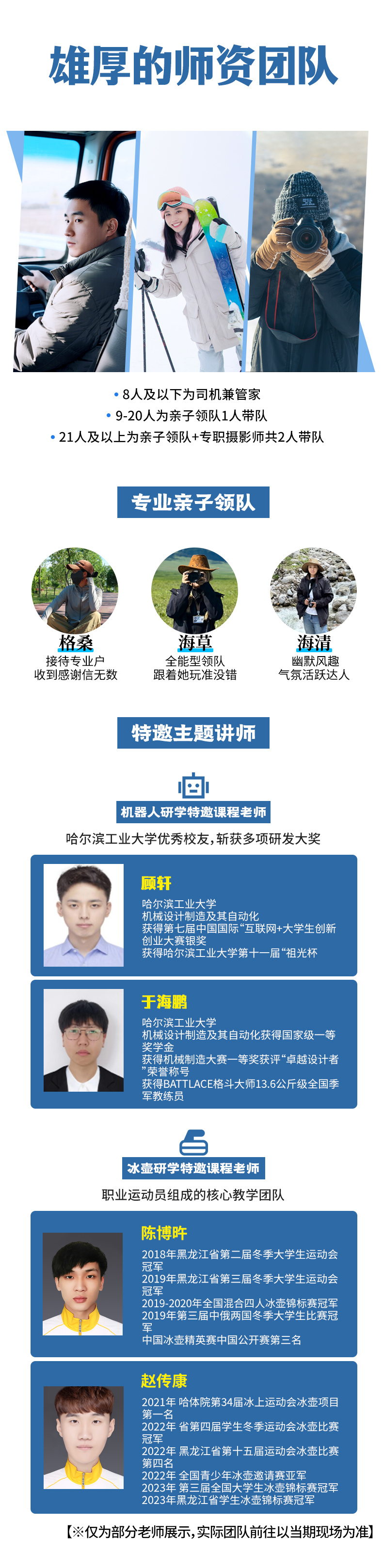 2、如当期人数不足10人,则取消冰壶研学项目和营养餐,上午前往伏尔加庄园,校外社会餐厅用餐,下午替换赠送为冰雪大世界(含儿童)。