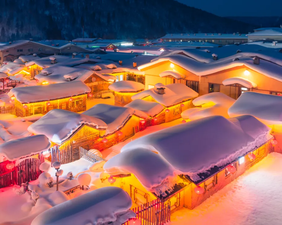 17:00 随后小朋友们集合,我们在一起制作【小冰灯】,把制作好的小冰灯放在室外等待一晚上就制作完成啦!随后雪乡内自由玩耍,可以走走雪韵大街,欣赏雪房子,寻找雪蘑菇,还可穿上乡村特色的花棉袄COSPLAY。东北冬季日落时间非常早,大约四点多的时候天就已经黑了,可以漫步棒槌山栈道,俯瞰【雪乡夜景】红红的灯笼映在洁白的雪地上