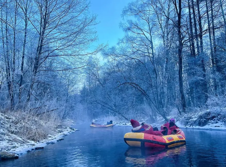 07:00 抵达【雾凇漂流】,当气温达到零下二三十度时,万物都被白雪冰凌覆盖,而航线上只有一条温泉河流静静流淌。漂流在雪林之中,看着两岸雾凇树挂(视天气情况),一派“船在水上漂,人在林中游”的意境。
