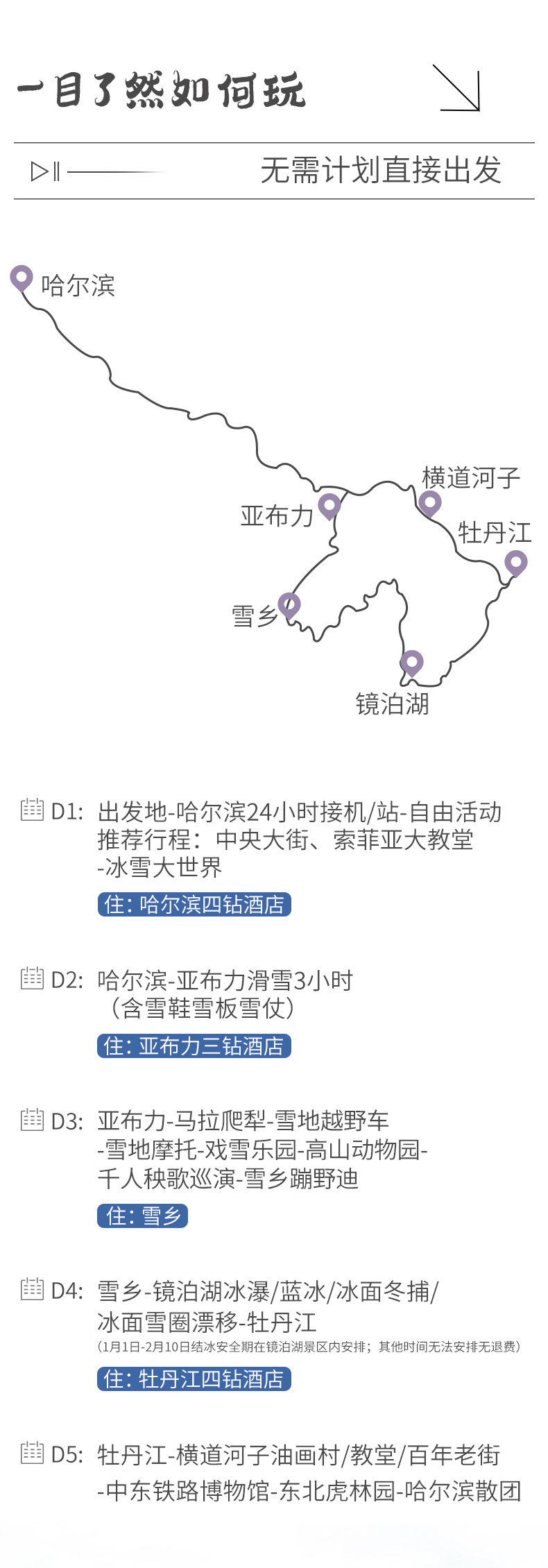 亚布力-马拉爬犁-雪地越野车(82KM,车程约2小时)-雪地摩托-戏雪乐园-高山动物园-千人秧歌巡演-雪乡蹦野迪(23KM,车程约0.5小时)