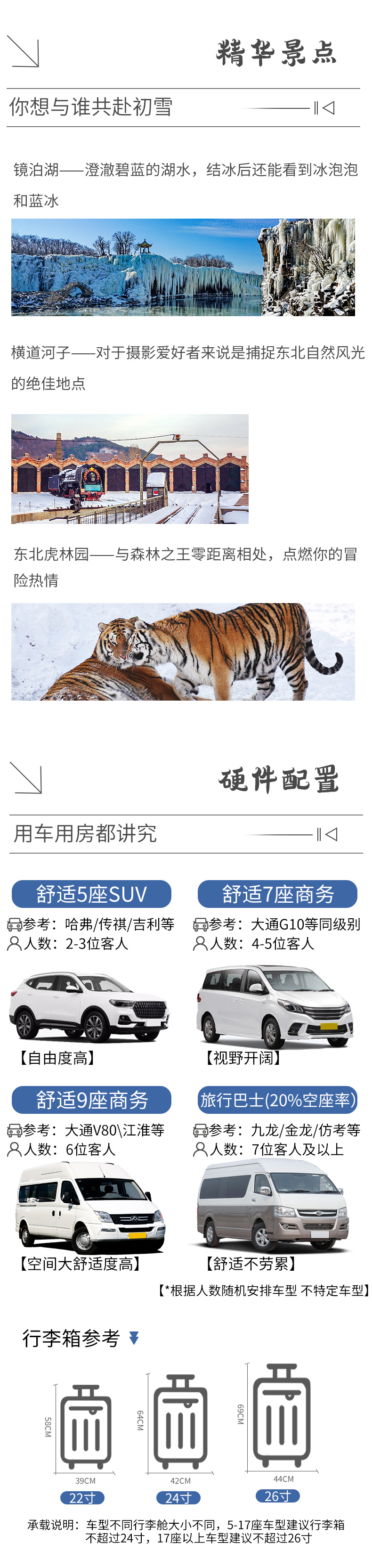 4、门票:雪乡门票+往返环保车、镜泊湖门票、东北虎林园;
