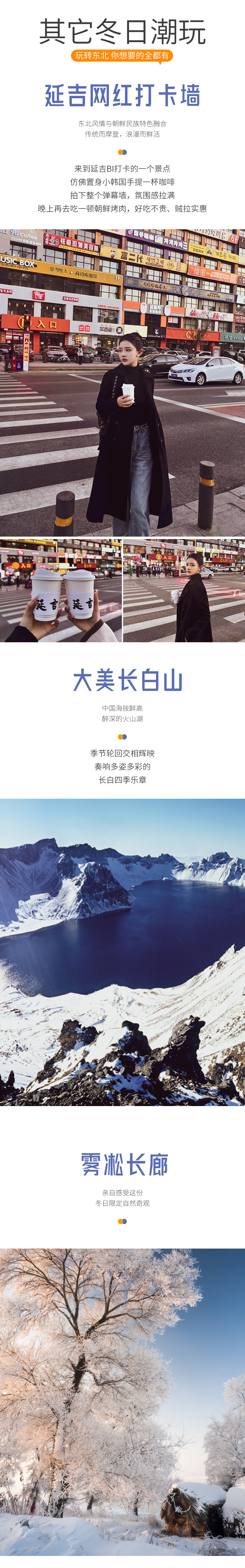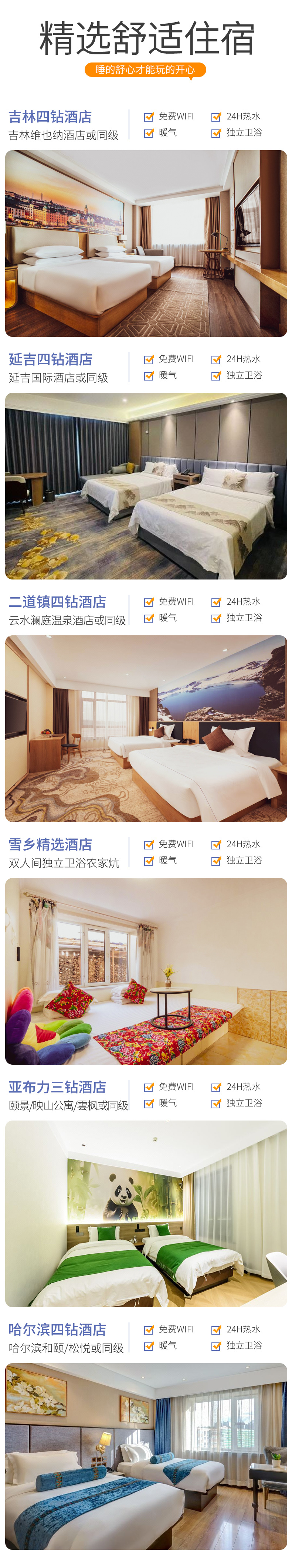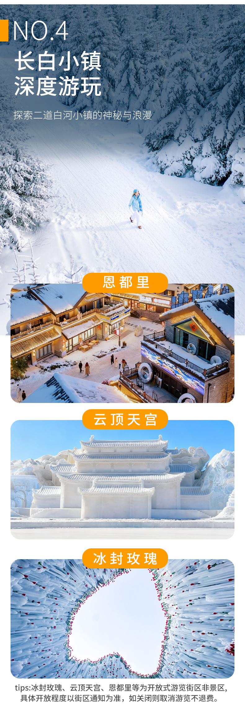 4、门票:雪乡门票+往返环保车、长白山门票+往返环保车+区间车+倒站车、延吉民俗园门票、冰雪大世界门票(未开放时间退门票328元/人);