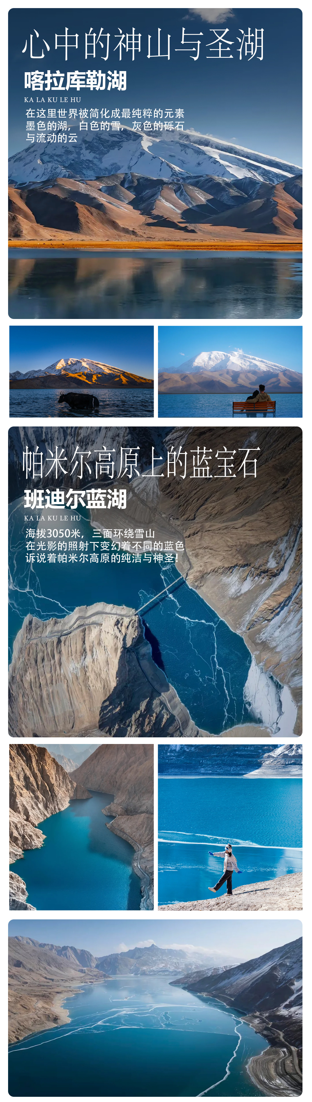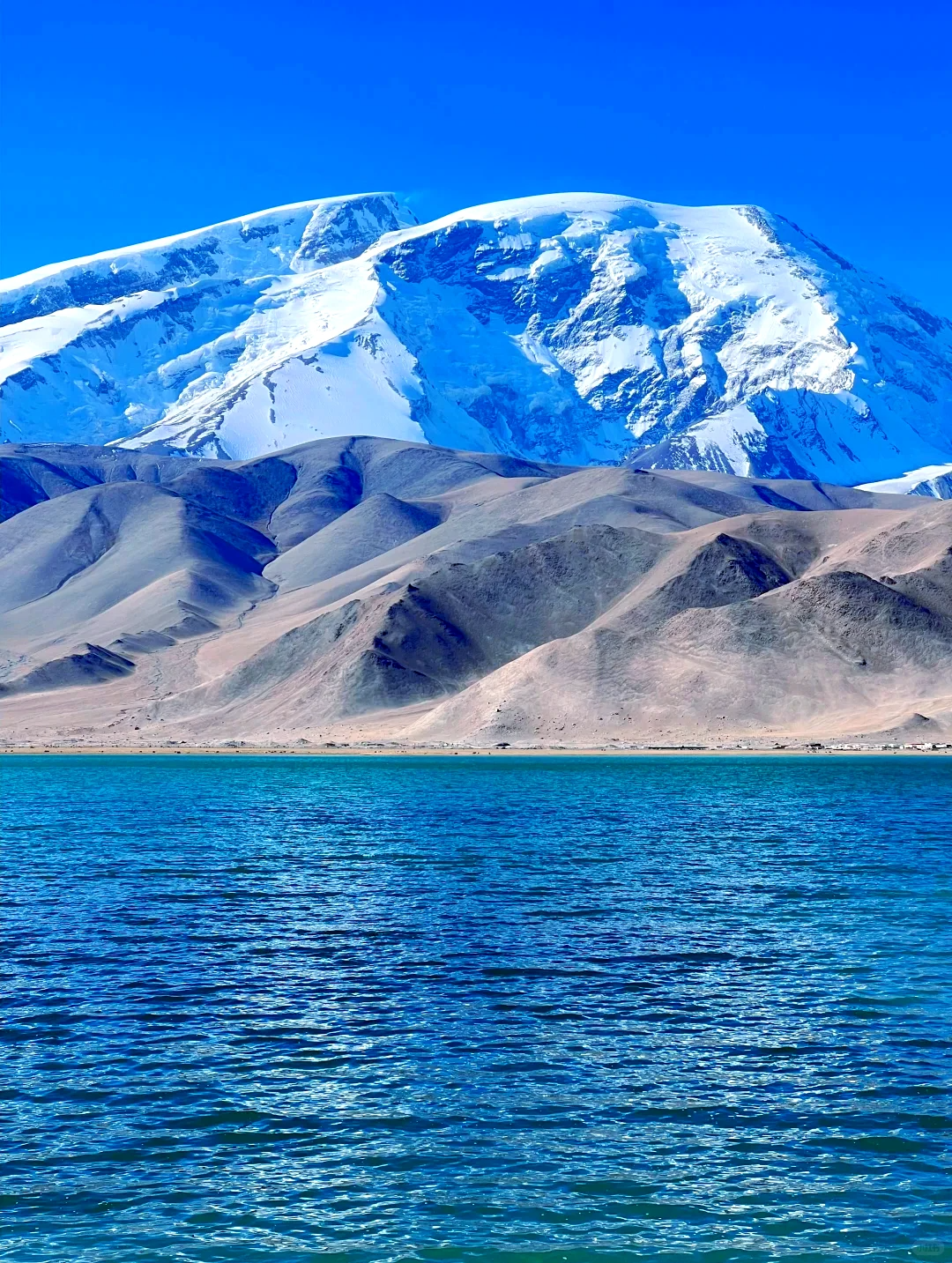 13:30-15:00 午餐后乘车前往游览【喀拉库勒湖】 ,俯看宽广波澜的湖水颜色变幻 ,可尽情的凹造型。高大的慕士塔格峰、公格尔峰、公格尔九别峰等终年不化的雪山,将卡拉库里湖紧紧环抱;天气晴朗之日,水面映衬着连成片的雪山,站在湖边远眺高耸的雪山,近观平静的湖泊,您会感受到高原独有的静谧、纯洁;