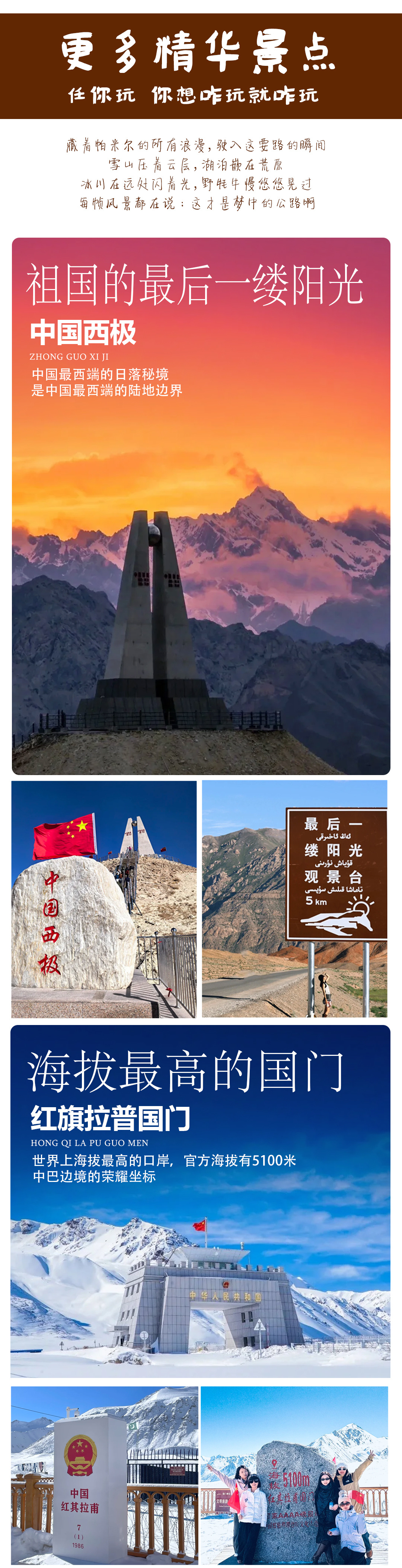 4.冬季塔县天气变化较大 ,如果天气原因【红其拉甫口岸/国门】未开放 ,则取消此景点 ,退门票费用 ,无法增加景点请各位理解并且知晓