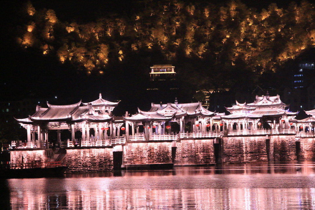 潮州古城灯光秀,韩山映射水波纹、波光粼粼,自然光色与古城风韵结合。诗的意境、画的取景,一江两岸即在画中,又在诗中,俨然有一股水墨乡愁丹青韵味。古城灯光秀是与气势磅礴的潮州音乐紧密结合,绝佳视觉、听觉享受!