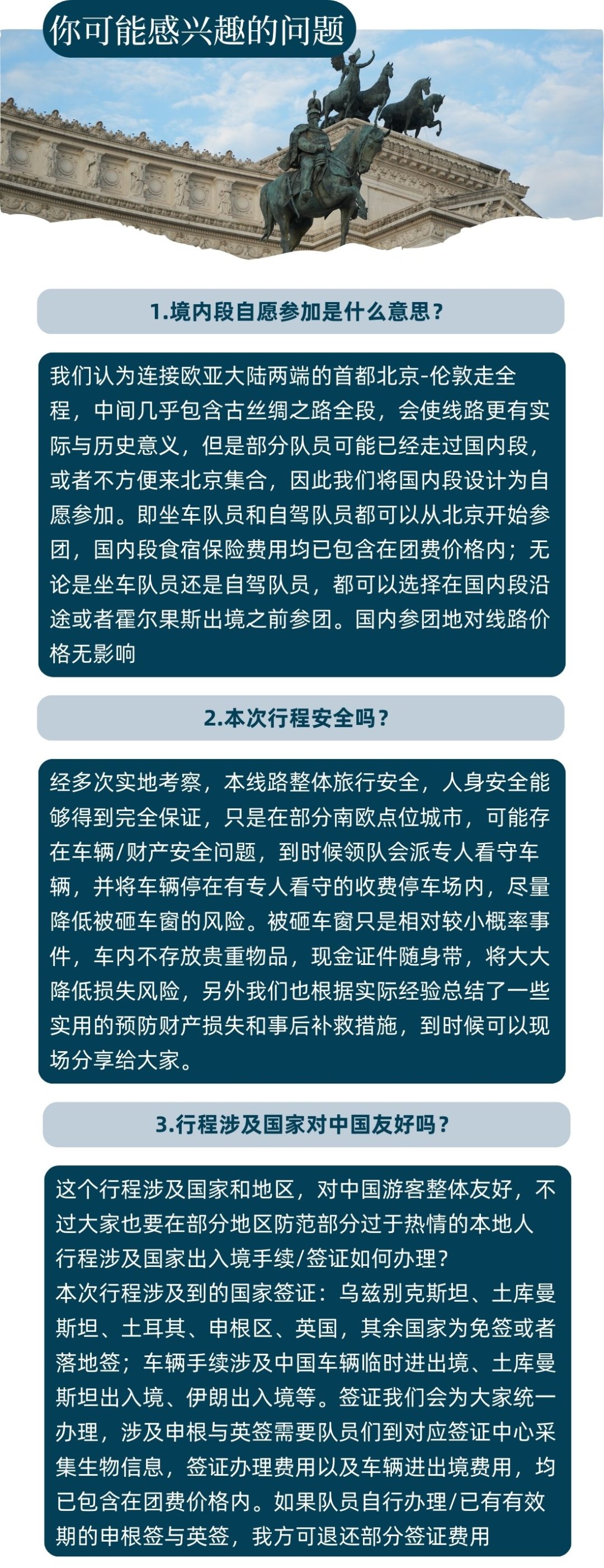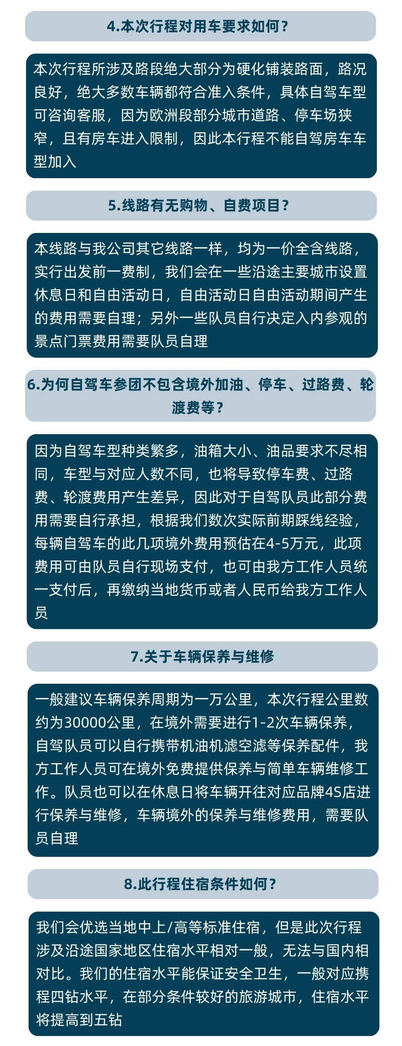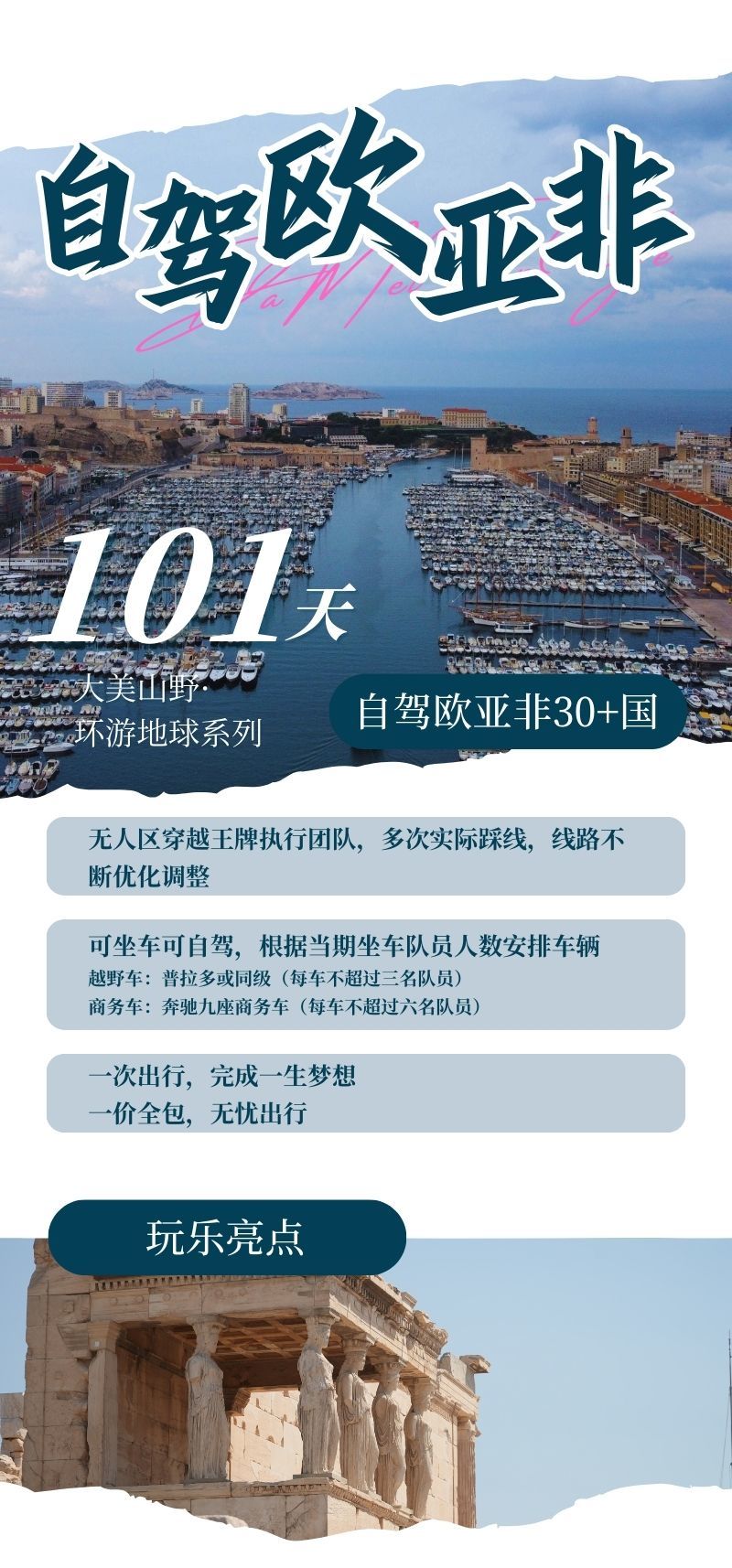你可能去过很多国家,但是你绝对没有一次自驾前往过三十多个国家,对于大多数国人来说,可能一生能前往的国家并不多,十个八个已经不算少数,而这次我们要带你一次前往欧亚非30+国家和地区,更何况这次我们还是开着自己的蓝牌车,横跨欧亚非大陆,真正做到一次出行,回忆一生;本线路经过多次前期踩线,实地验证,可以跟着我们无忧出发;秉承我公司一贯一价全含线路设计思路,一费制旅行,让旅行变得简单与纯粹,你只需要做好出发的决定,剩下的都交给我们;自驾欧亚非线路是我们自驾环游地球系列的首推线路,后续我们还会视情况推出泛美公路自驾、非洲大陆环游、澳新自驾、南极大陆等系列线路