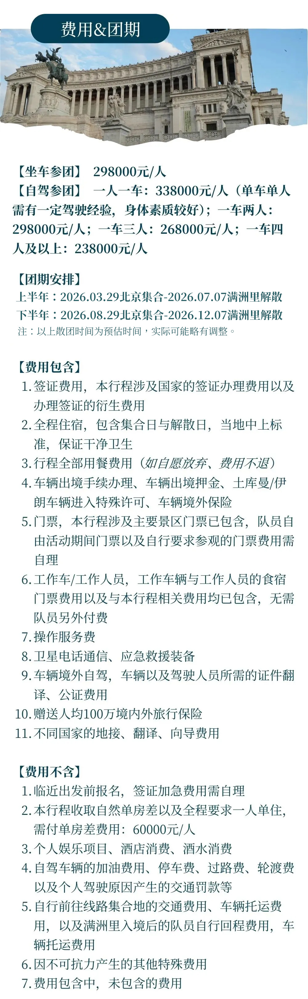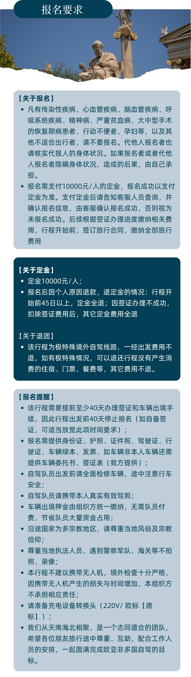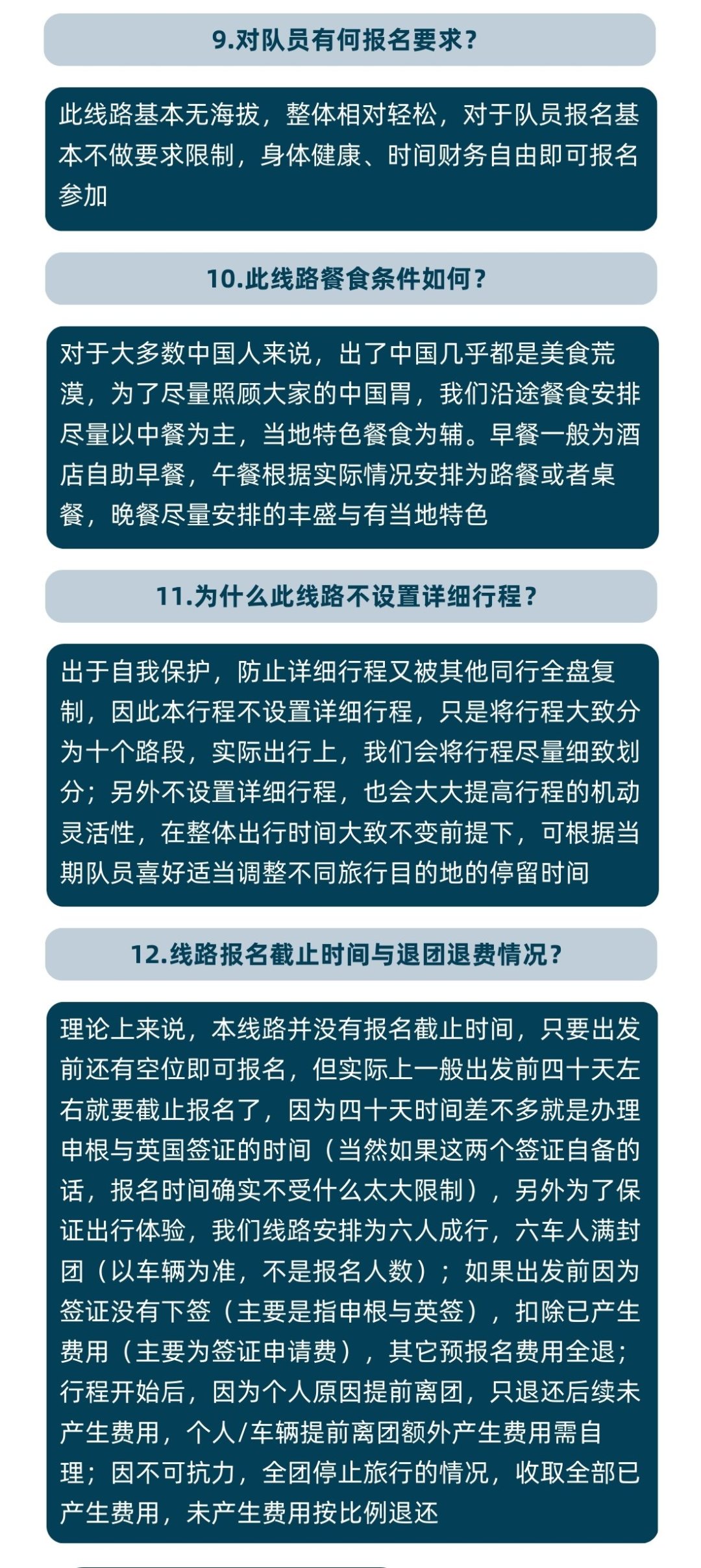 你可能去过很多国家,但是你绝对没有一次自驾前往过三十多个国家,对于大多数国人来说,可能一生能前往的国家并不多,十个八个已经不算少数,而这次我们要带你一次前往欧亚非30+国家和地区,更何况这次我们还是开着自己的蓝牌车,横跨欧亚非大陆,真正做到一次出行,回忆一生;本线路经过多次前期踩线,实地验证,可以跟着我们无忧出发;秉承我公司一贯一价全含线路设计思路,一费制旅行,让旅行变得简单与纯粹,你只需要做好出发的决定,剩下的都交给我们;自驾欧亚非线路是我们自驾环游地球系列的首推线路,后续我们还会视情况推出泛美公路自驾、非洲大陆环游、澳新自驾、南极大陆等系列线路
