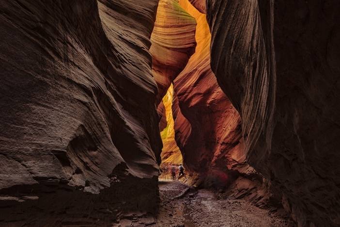 如果说羚羊谷是抽象的线条与色彩之美,那么雨岔大峡谷除此之外,还有着羚羊谷所没有的生命之美。景区入口仿佛是通往异世界的大门,因为雨水多,很多苔藓附着在岩石表面,青翠的绿色是旺盛的生命力,令人耳目一新。穿过缝隙往前走,光线在红砂岩地质上折射出不同色彩。更妙的是,正午的阳光洒在头顶,就像神明的眷顾。
