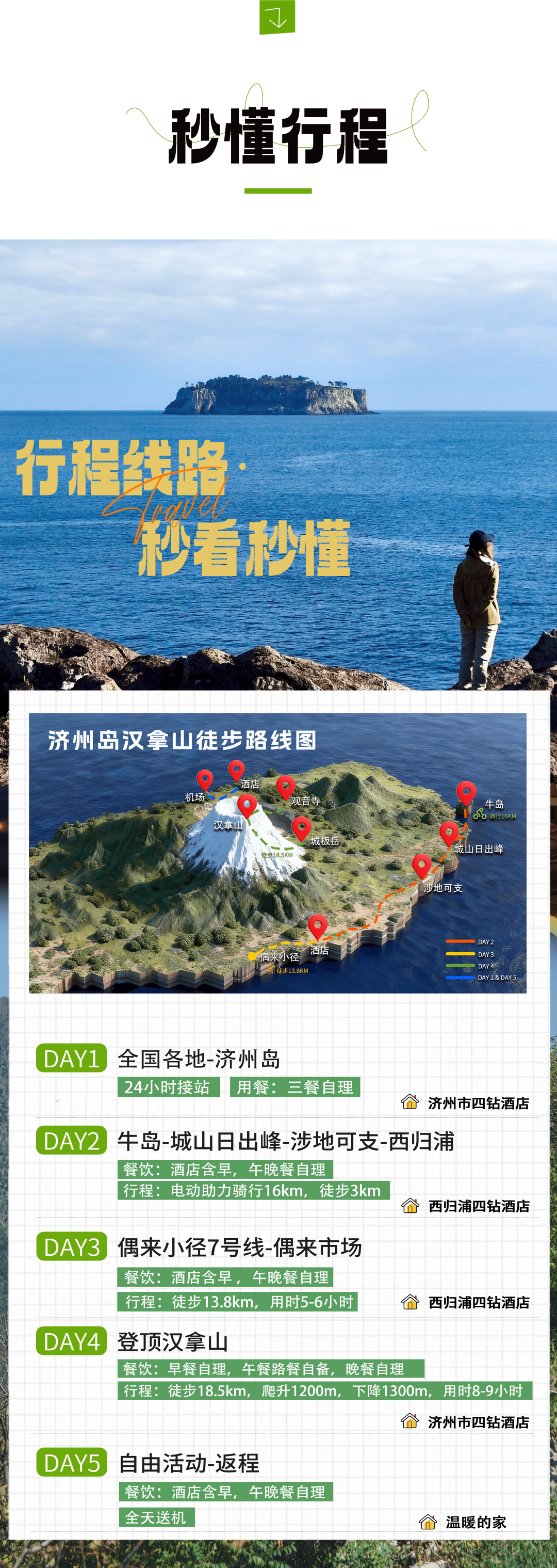 · 地理环境:济州岛的地形以山地和火山口为主。如果计划前往汉拿山等登山活动,务必随身携带足够的水、食物和适当的徒步装备。