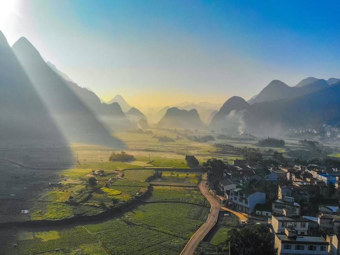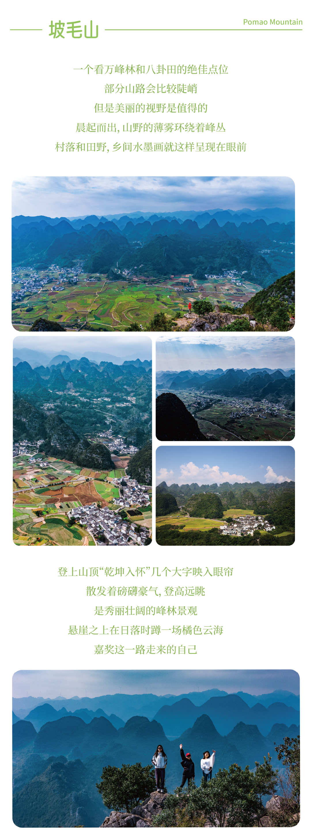 早餐后前往【坡毛山】,徒步登顶,俯瞰八卦田与万峰林构成的“千里江山图”。随后环线下山,乘车至【万峰林月亮洞】徒步起点。