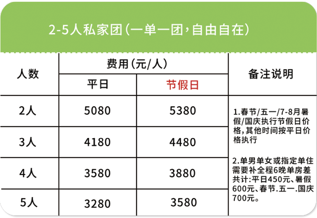 ➂ 单房差:单人报名默认同性拼房(拼房不成功无需另付单房差);指定单住或1成人带1儿童(需补全程6晚单房差价共计:平日450元/人,暑假600元/人,春节、五一、国庆700元),2人一起报名默认住1间房(如需分开住请主动说明)