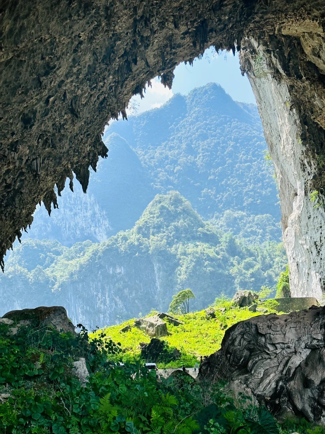 沿着步道往上会经过飞龙穿洞,洞长193米,宽44-62米,高54-100米,洞顶上石钟乳发育,造型奇异,似龙爪倒吊。