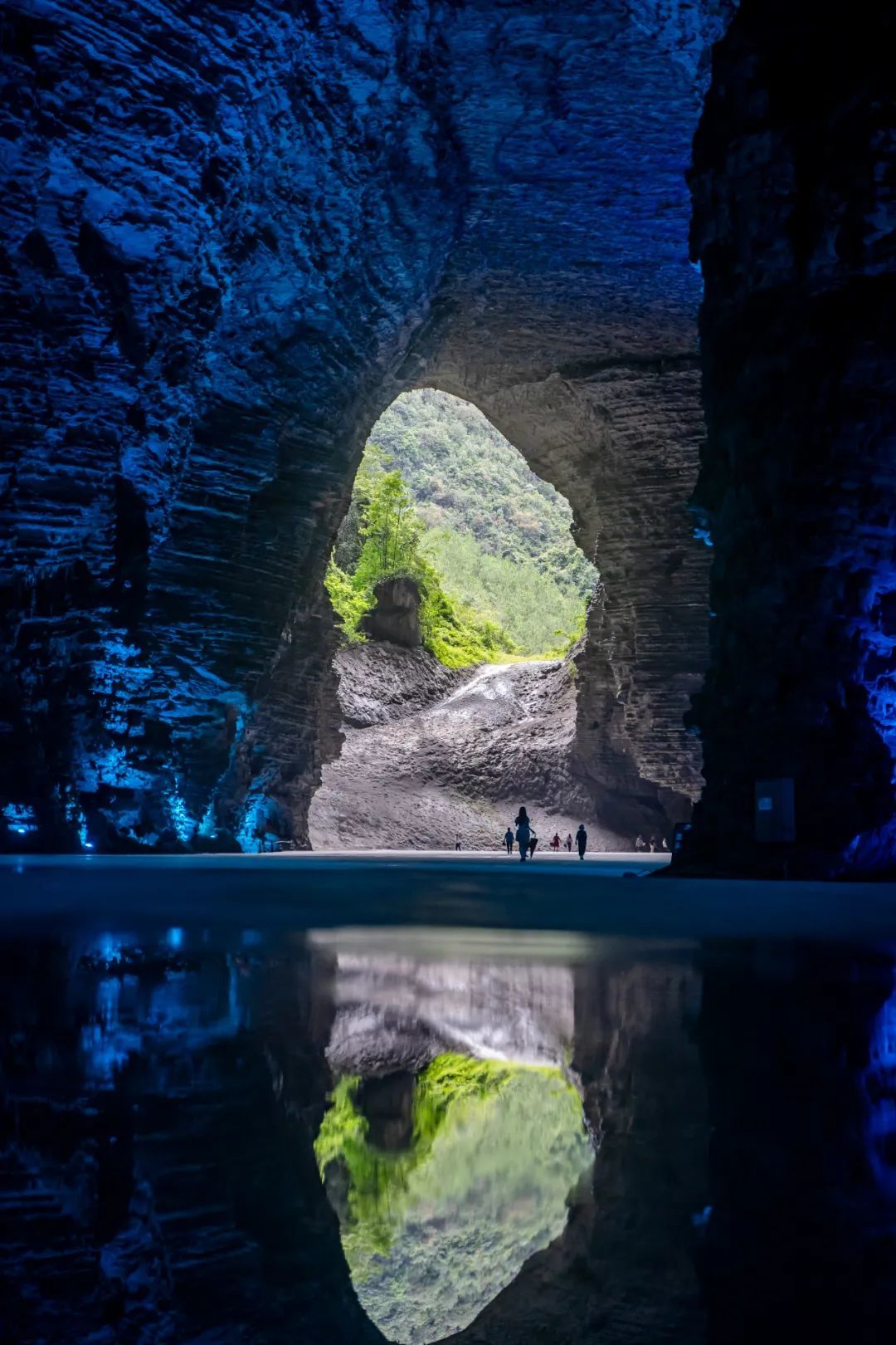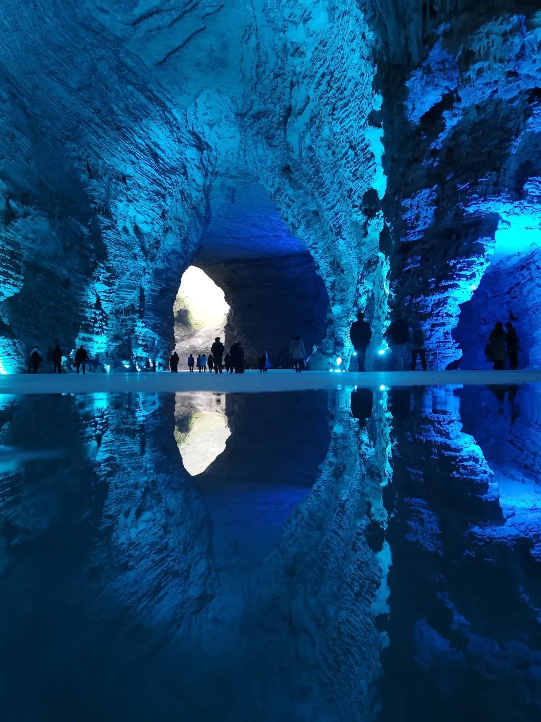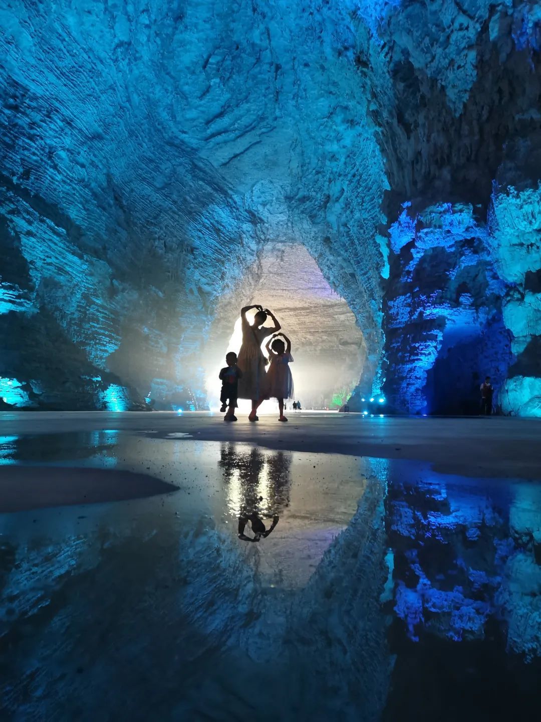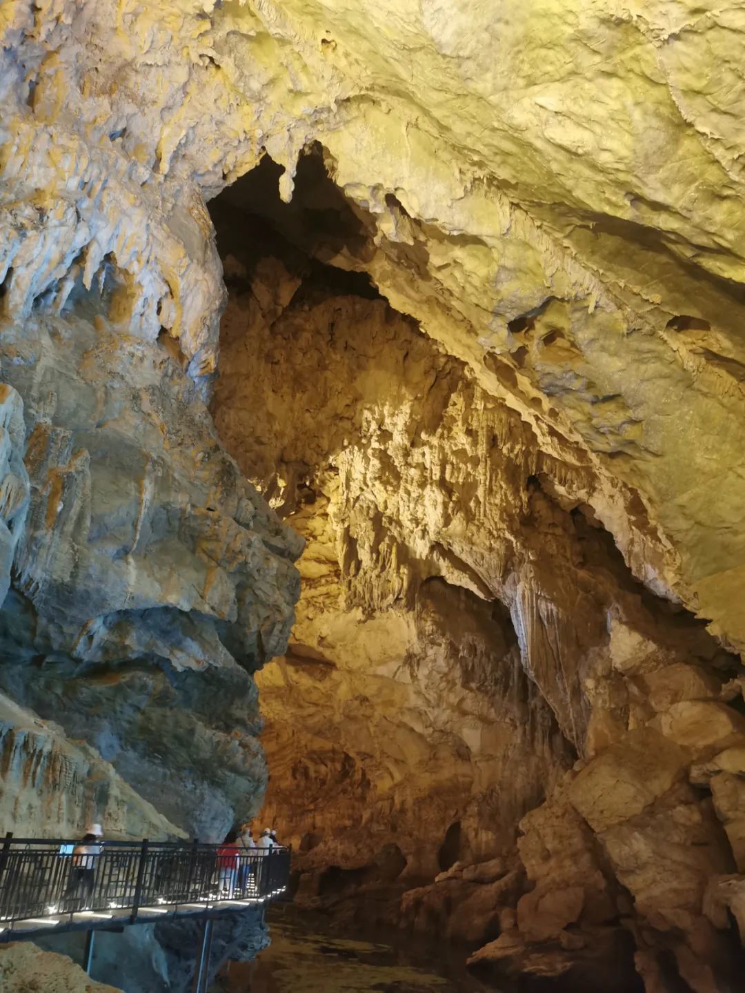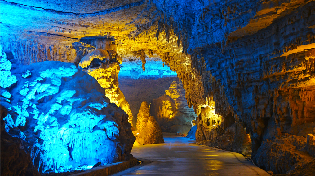低头俯瞰,脚下是暗流涌动的地下河,清澈的河水倒映上方的钟乳石,虚实交错间更添几分神秘与幽邃。洞中恒温16℃左右,能让你在大自然的空调房中卸下一身暑气。