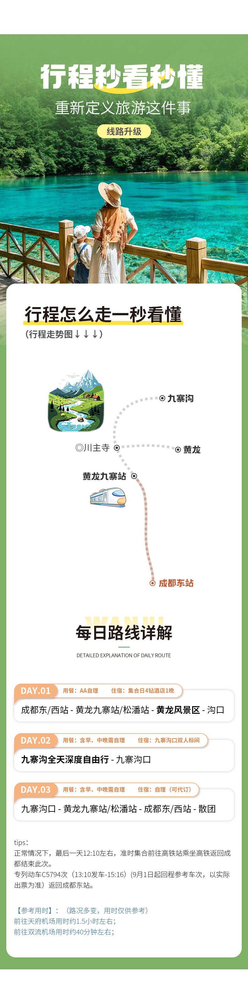 早上根据时间自行前往成都东站(建议至少提前1小时约09:30左右抵达车站)乘专列动车C5792次(10:29发车-12:20)(8月31日起参考车次,以实际出票为准)前往黄龙九寨站(时长约2h))