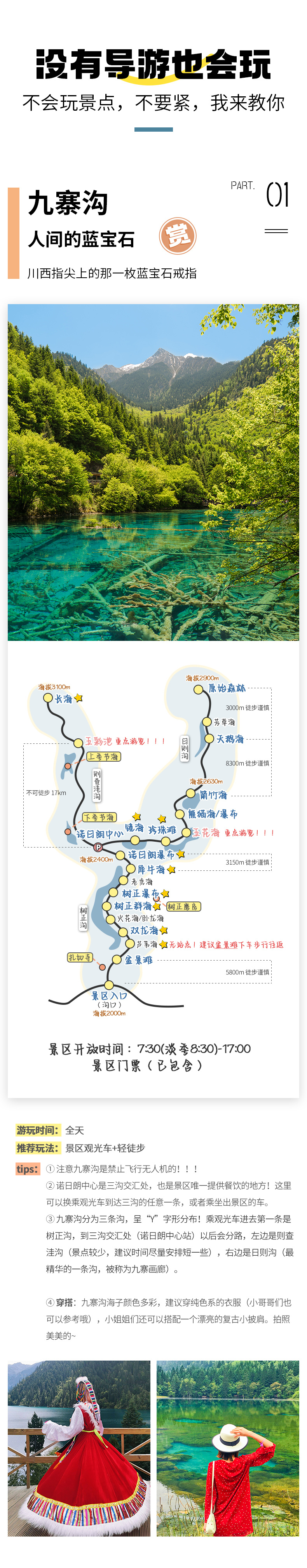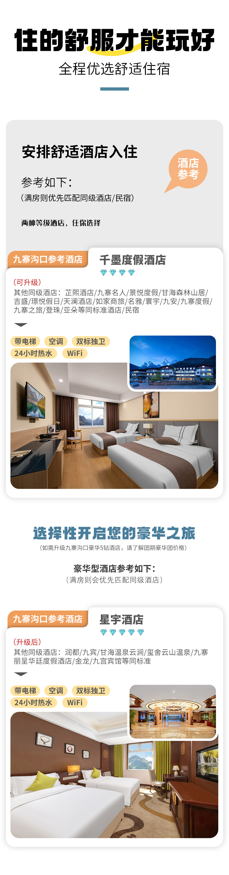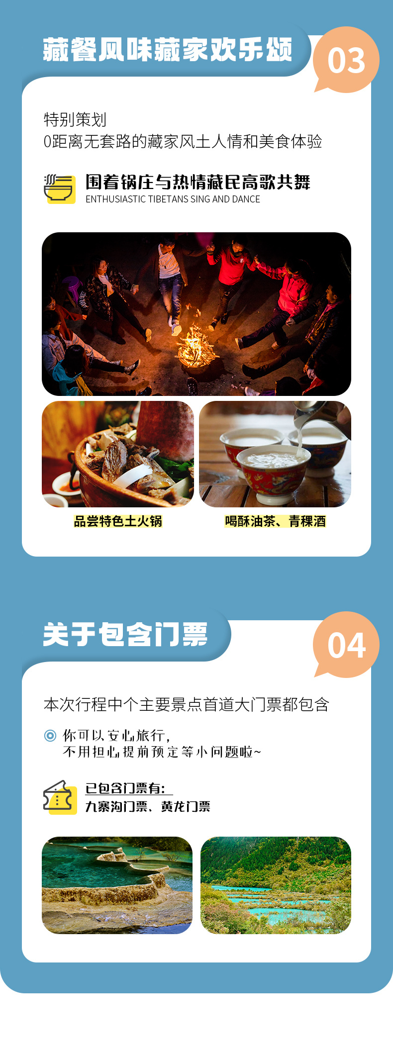 1、九寨沟海拔1900-3100米,多数旅游者无高原反应;领票及排队进入景区等待时间根据当天客流决定。景区实际开放区域及游览方式和路线以届时景区官方公布为准,敬请理解!游客采取乘车和步行相结合方式游览。游客统一乘坐观光车进入景区游览,观光车在景区内以公交车方式运行。随团司机无法陪同,敬请理解;