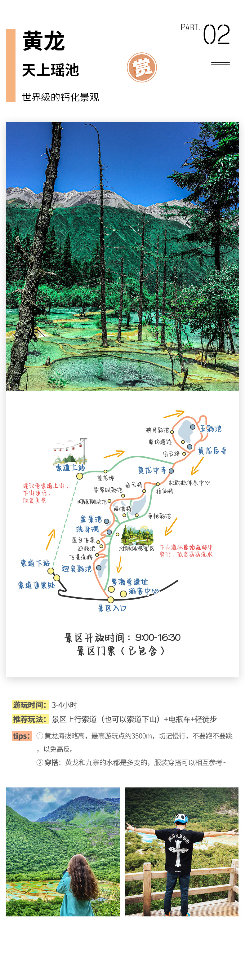 黄龙风景区(门票已含,游览时间约4小时);建议最佳游览方式:索道上山--穿越原始森林--步行游览五彩池--五彩池步行下山;(黄龙冬季索道或因检修停运,需步行上下山,请量力而行)