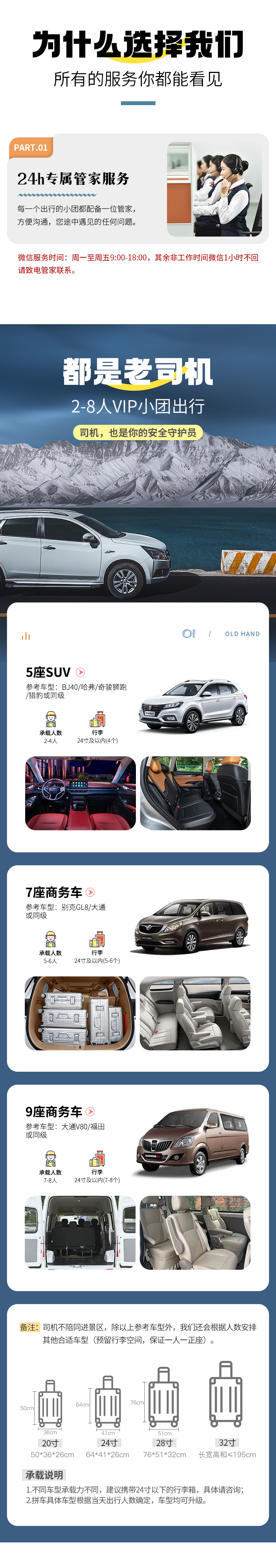 备注:车型承载力有限,携带行李为24寸或以下行李箱。