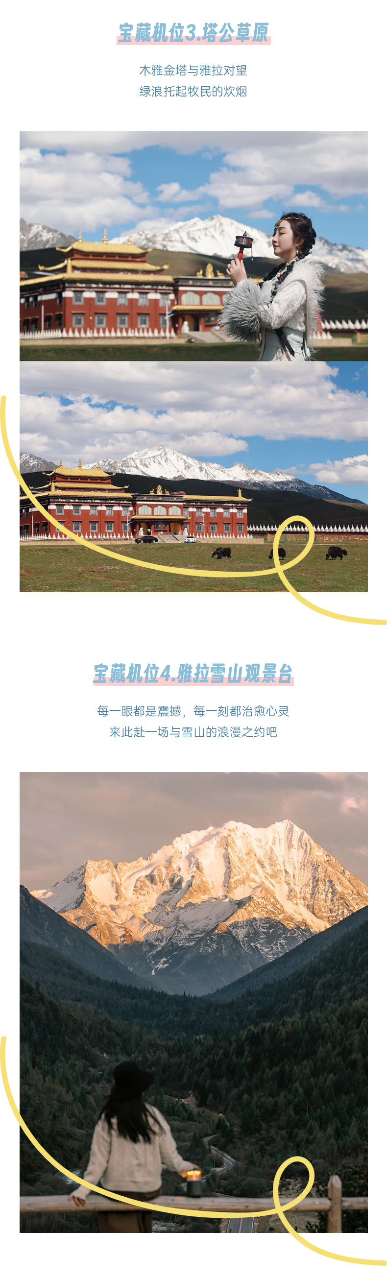 景点海拔:塔公草原(3730)、木雅大寺(3800)、野墨石(3500)、雅拉观景台(3500)