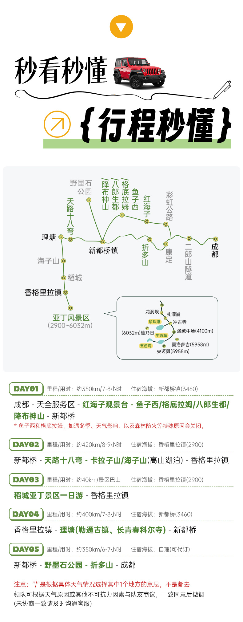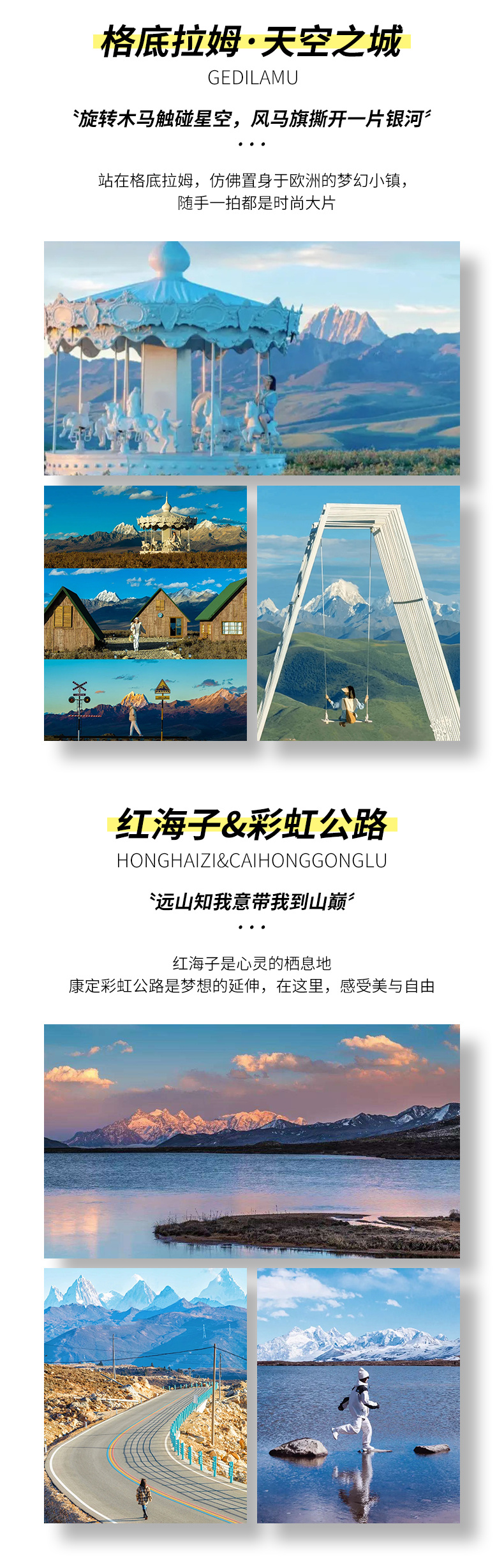 景点海拔:天全服务区(680)、红海子观景台(4100)、鱼子西/格底拉姆/八郎生都(4200)